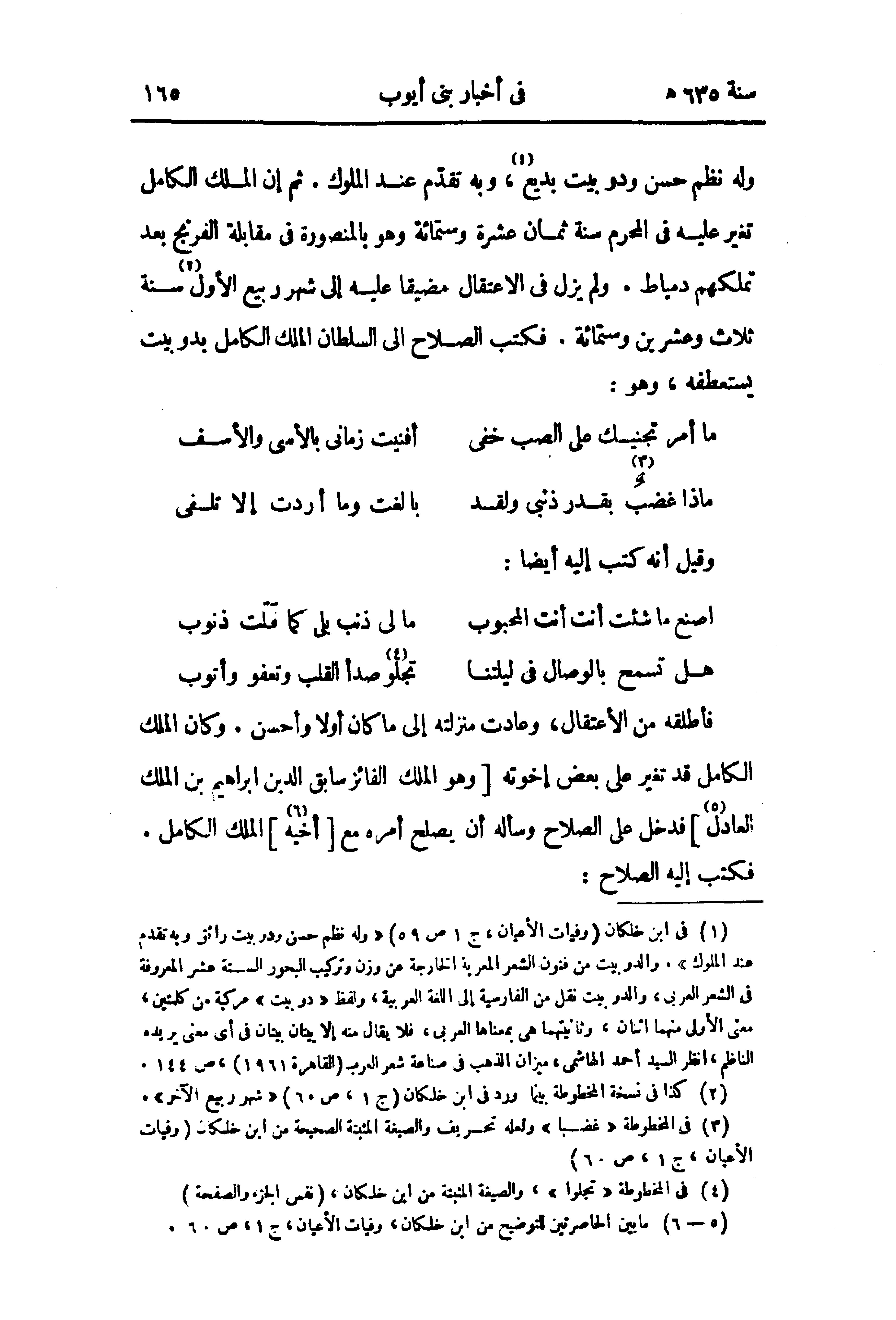 (¬1) في ابن خلكان (وفيات الأعيان، ج 1 ص 59) «وله نظم حسن ودو بيت رائق وبه تقدم عند الملوك». والدو بيت من فنون الشعر المعربة الخارجة عن وزن وتركيب البحور الستة عشر المعروفة في الشعر العربى، والدو بيت نقل من الفارسية إلى اللغة العربية، ولفظ «دو بيت» مركبة من كلمتين، معنى الأولى منهما اثنان، وثانيتهما هى بمعناها العربى، فلا يقال منه إلا بيتان بيتان في أي معنى يريده الناظم، انظر السيد أحمد الهاشمى، ميزان الذهب في صناعة شعر العرب (القاهرة 1961)، ص 144.