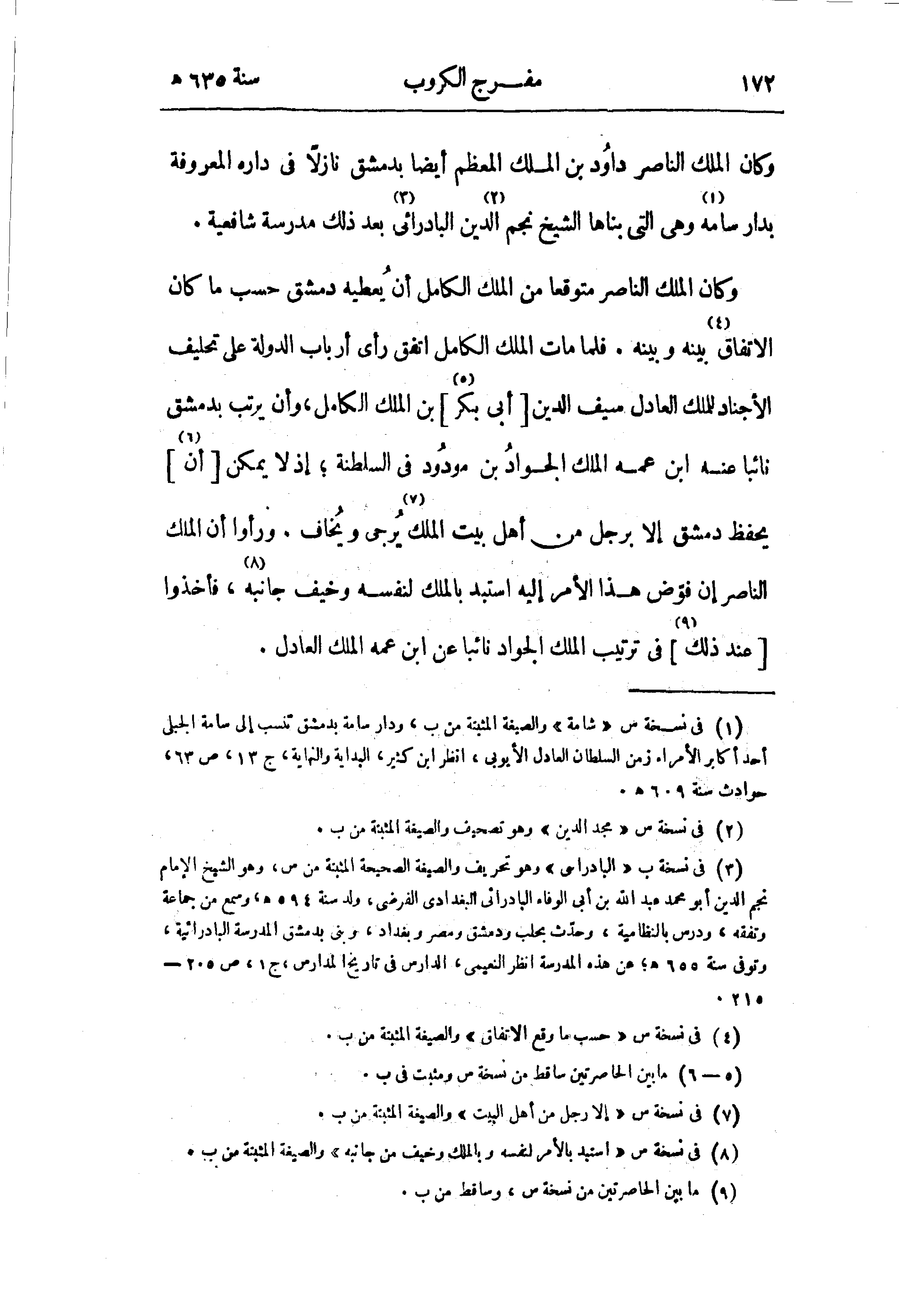 (¬3) في نسخة ب «البادرائى» وهو تحريف والصيغة الصحيحة المثبتة من س، وهو الشيخ الإمام نجم الدين أبو محمد عبد الله بن أبى الوفاء البادرائى البغدادى الفرضى، ولد سنة 594 هـ، وسمع من جماعة وتفقه، ودرس بالنظامية، وحدّث بحلب ودمشق ومصر وبغداد، وبنى بدمشق المدرسة البادرائية، وتوفى سنة 655 هـ؛ عن هذه المدرسة انظر النعيمى، الدارس في تاريخ المدارس، ج 1، ص 205 - 215.