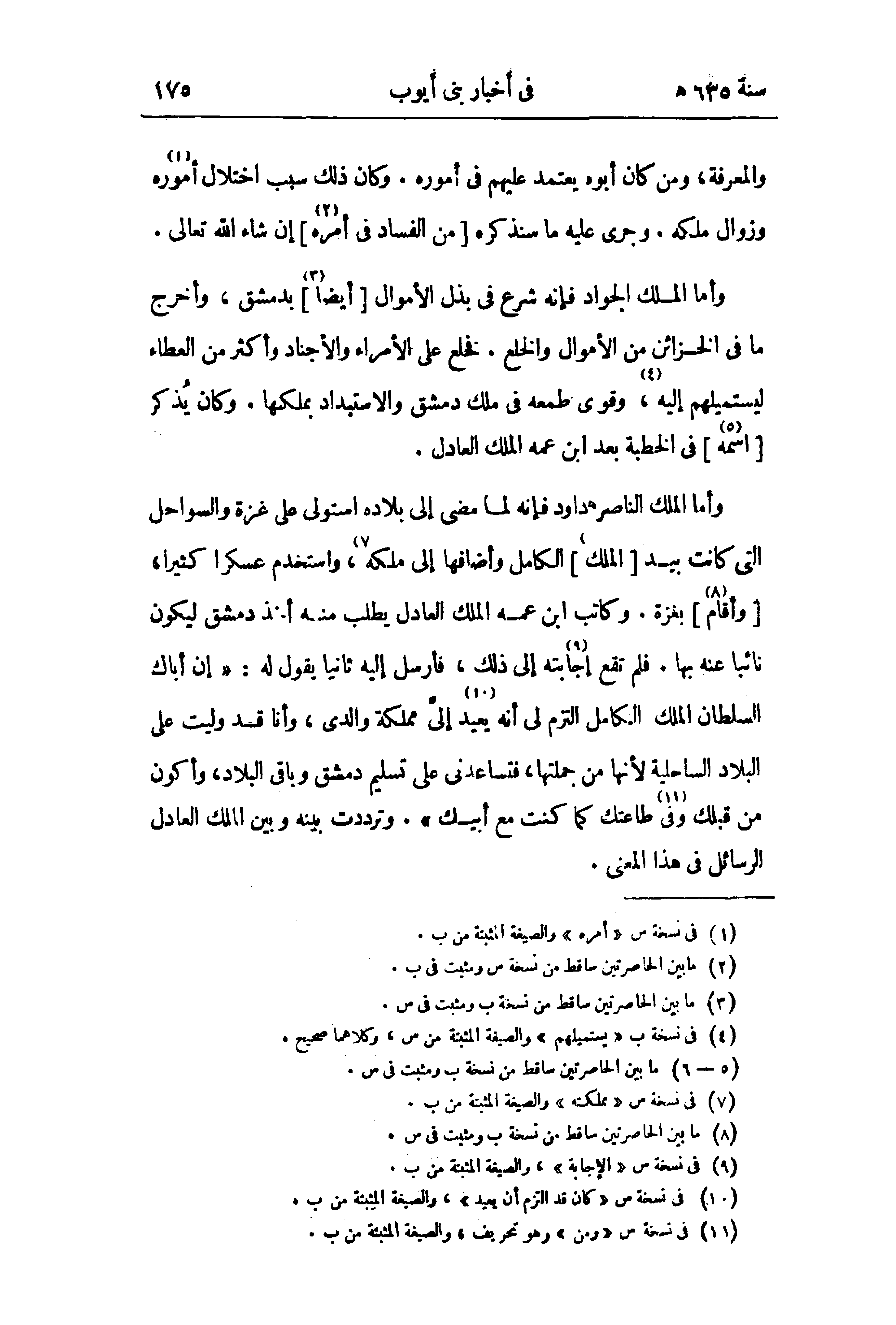 وأما الملك الناصر داود فإنه لما مضى إلى بلاده استولى على غزة والسواحل التي كانت بيد [الملك (¬6)] الكامل وأضافها إلى ملكه (¬7)، واستخدم عسكرا كثيرا، [وأقام (¬8)] بغزة. وكاتب ابن عمه الملك العادل يطلب منه أخذ دمشق ليكون نائبا عنه بها. فلم تقع إجابته (¬9) إلى ذلك، فأرسل إليه ثانيا يقول له: «إن أباك السلطان الملك الكامل التزم لى أنه يعيد (¬10) إلىّ مملكة والدى، وأنا قد وليت على البلاد الساحلية لأنها من جملتها، فتساعدنى على تسليم دمشق وباقى البلاد، وأكون من قبلك وفى (¬11) طاعتك كما كنت مع أبيك». وترددت بينه وبين الملك العادل الرسائل في هذا المعنى.
