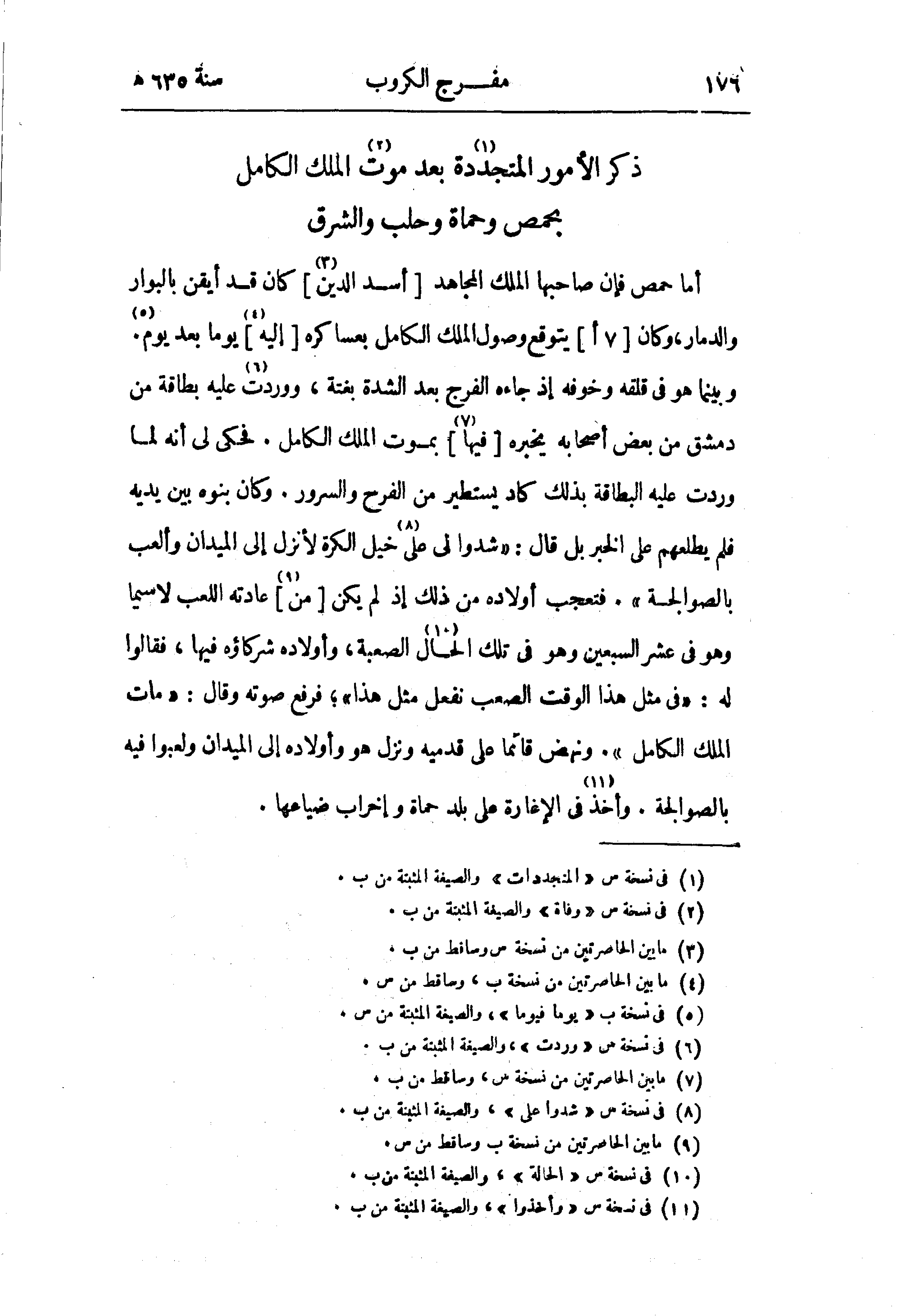 وبينما هو في قلقه وخوفه إذ جاءه الفرج بعد الشدة بغتة، ووردت (¬6) عليه بطاقة من دمشق من بعض أصحابه يخبره [فيها (¬7)] بموت الملك الكامل. فحكى لى أنه لما وردت عليه البطاقة بذلك كاد يستطير من الفرح والسرور. وكان بنوه بين يديه فلم يطلعهم على الخبر بل قال: «شدوا لى على (¬8) خيل الكرة لأنزل إلى الميدان وألعب بالصوالجة». فتعجب أولاده من ذلك إذ لم يكن [من (¬9)] عادته اللعب لا سيما وهو في عشر السبعين وهو في تلك الحال (¬10) الصعبة، وأولاده شركاؤه فيها، فقالوا له: «في مثل هذا الوقت الصعب نفعل مثل هذا»؛ فرفع صوته وقال: «مات الملك الكامل». ونهض قائما على قدميه ونزل هو وأولاده إلى الميدان ولعبوا فيه بالصوالجة. وأخذ (¬11) في الإغارة على بلد حماة وإخراب ضياعها.