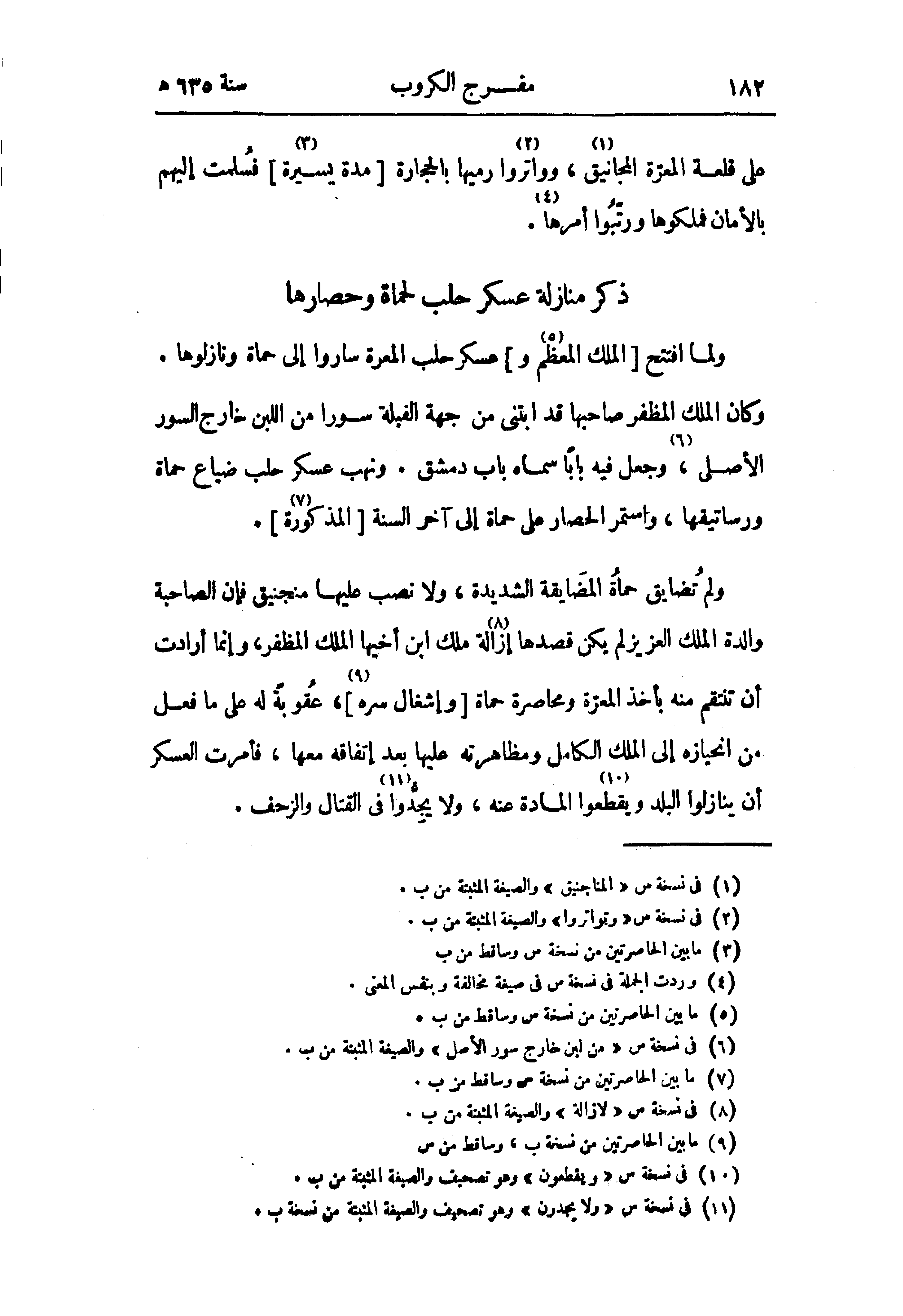 وكان الملك المظفر صاحبها قد ابتنى من جهة القبلة سورا من اللبن خارج السور الأصلى (¬6)، وجعل فيه بابا سماه باب دمشق. ونهب عسكر حلب ضياع حماة ورساتيقها، واستمر الحصار على حماة إلى آخر السنة [المذكورة (¬7)].