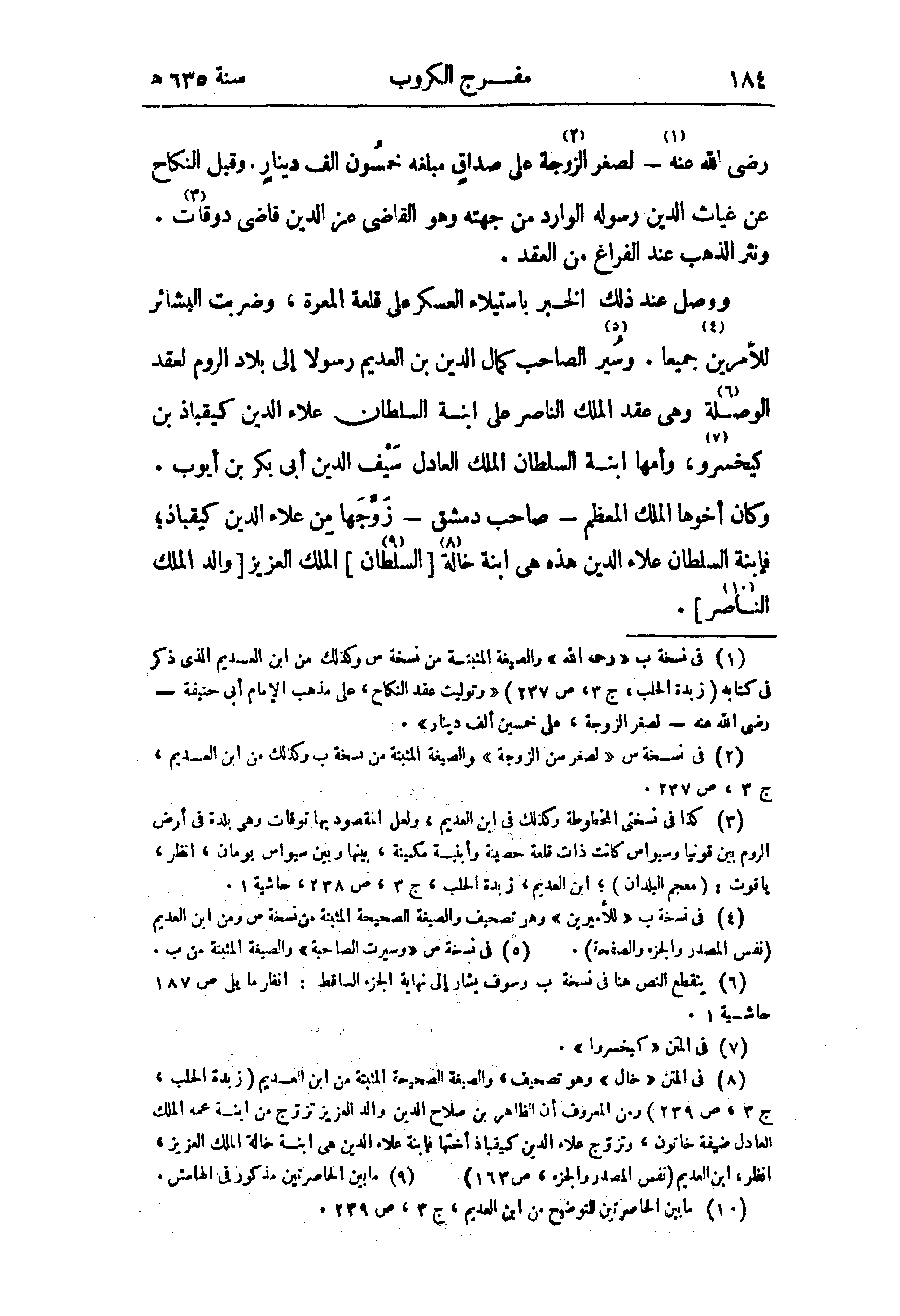 ووصل عند ذلك الخبر باستيلاء العسكر على قلعة المعرة، وضربت البشائر للامرين (¬4) جميعا. وسير (¬5) الصاحب كمال الدين بن العديم رسولا إلى بلاد الروم لعقد الوصلة (¬6) وهى عقد الملك الناصر على ابنة السلطان علاء الدين كيقباذ بن كيخسرو (¬7)، وأمها ابنة السلطان الملك العادل سيف الدين أبى بكر بن أيوب.