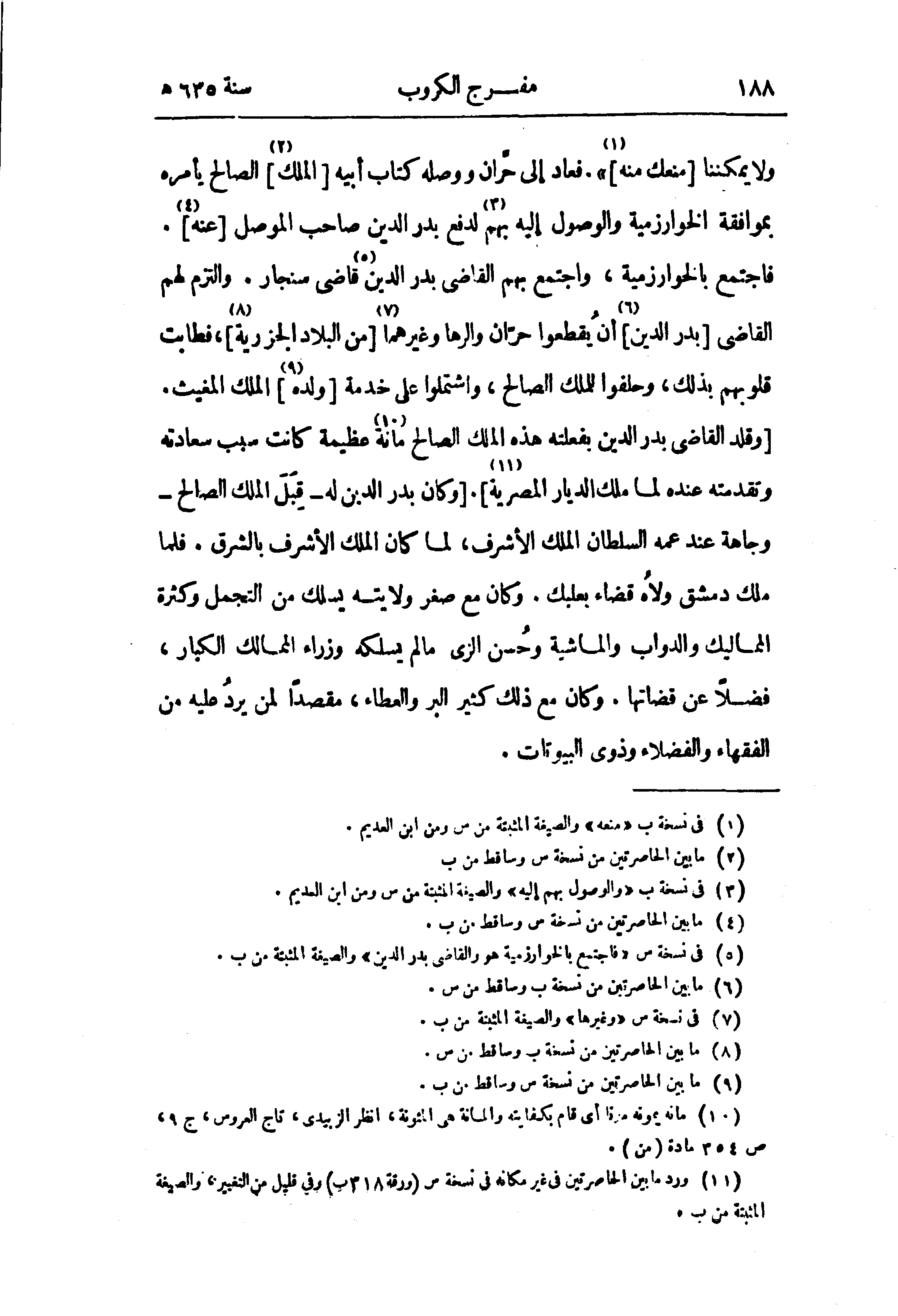 [وقلد القاضى بدر الدين بفعلته هذه الملك الصالح مانة (¬10) عظيمة كانت سبب سعادته وتقدمته عنده لما ملك الديار المصرية (¬11)]. [وكان بدر الدين له - قبل الملك الصالح - وجاهة عند عمه السلطان الملك الأشرف، لما كان الملك الأشرف بالشرق. فلما ملك دمشق ولاه قضاء بعلبك. وكان مع صغر ولايته يسلك من التجمل وكثرة المماليك والدواب والماشية وحسن الزى ما لم يسلكه وزراء الممالك الكبار، فضلا عن قضاتها. وكان مع ذلك كثير البر والعطاء، مقصدا لمن يرد عليه من الفقهاء والفضلاء وذوى البيوتات.