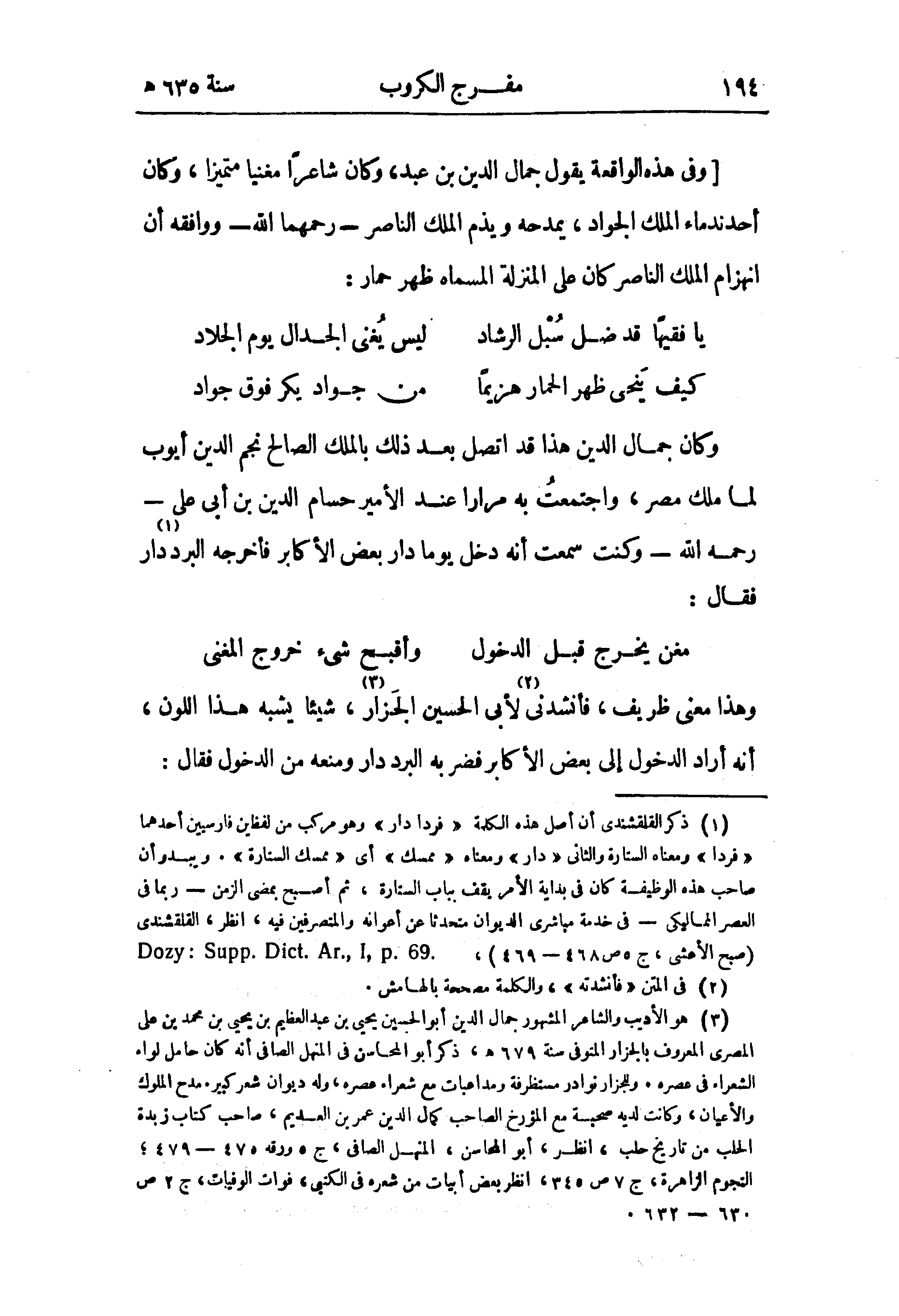 (¬3) هو الأديب والشاعر المشهور جمال الدين أبو الحسين يحيى بن عبد العظيم بن يحيى بن محمد بن على المصرى المعروف بالجزار المتوفى سنة 679 هـ، ذكر أبو المحاسن في المنهل الصافى أنه كان حامل لواء الشعراء في عصره. وللجزار نوادر مستظرفة ومداعبات مع شعراء عصره، وله ديوان شعر كبير. مدح الملوك والأعيان، وكانت لديه صحبة مع المؤرخ الصاحب كمال الدين عمر بن العديم، صاحب كتاب زبدة الحلب من تاريخ حلب، انظر، أبو المحاسن، المنهل الصافى، ج 5 ورقه 475 - 479؛ النجوم الزاهرة، ج 7 ص 345، انظر بعض أبيات من شعره في الكتبى، فوات الوفيات، ج 2 ص 630 - 632.