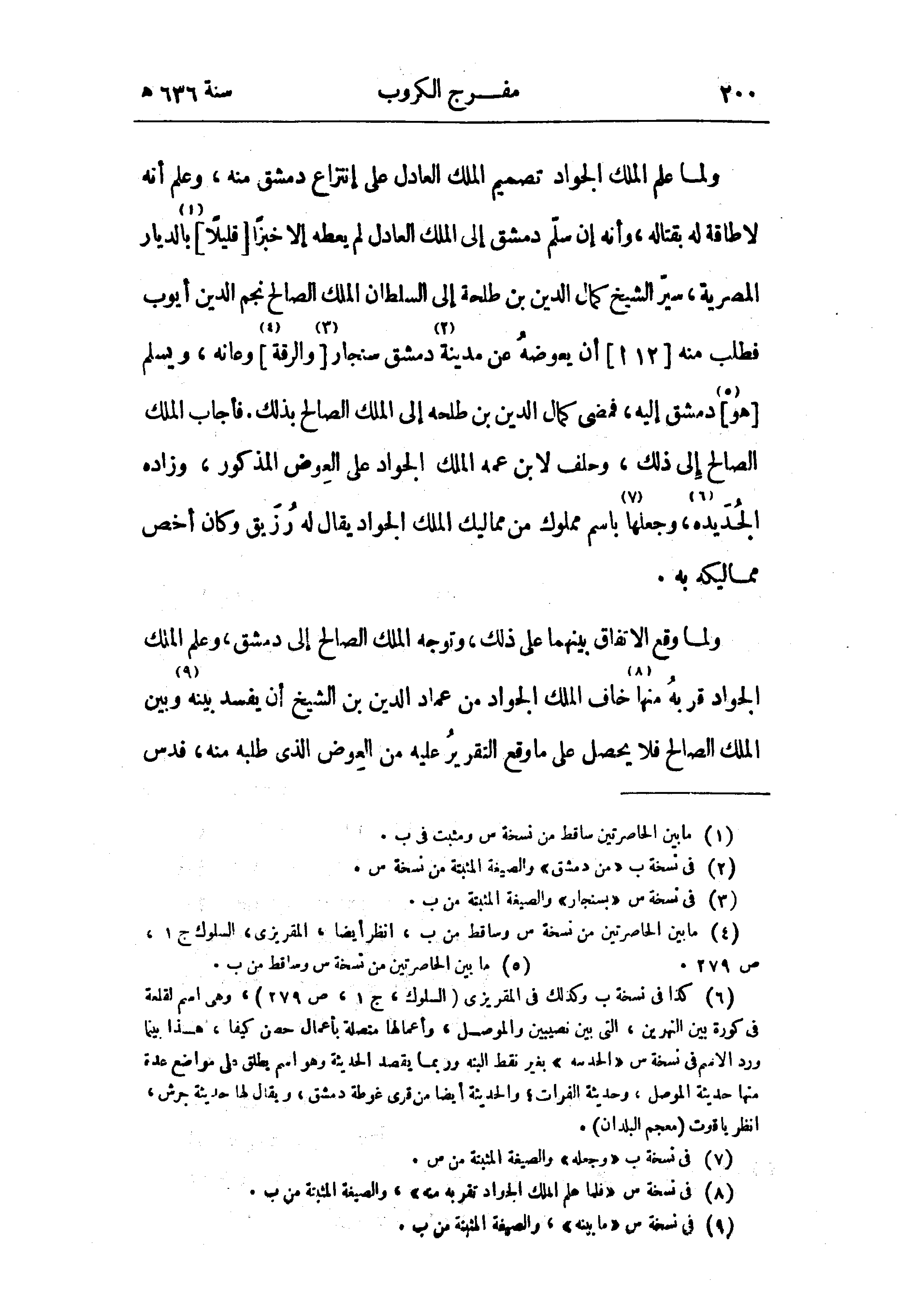 (¬6) كذا في نسخة ب وكذلك في المقريزى (السلوك، ج 1، ص 279)، وهى اسم لقلعة في كورة بين النهرين، التي بين نصيبين والموصل، وأعمالها متصلة بأعمال حصن كيفا، هذا بينما ورد الاسم في نسخة س «الحدسه» بغير نقط البته وربما يقصد الحديثة وهو اسم يطلق على مواضع عدة منها حديثة الموصل، وحديثة الفرات؛ والحديثة أيضا من قرى غوطة دمشق، ويقال لها حديثة جرش، انظر ياقوت (معجم البلدان).