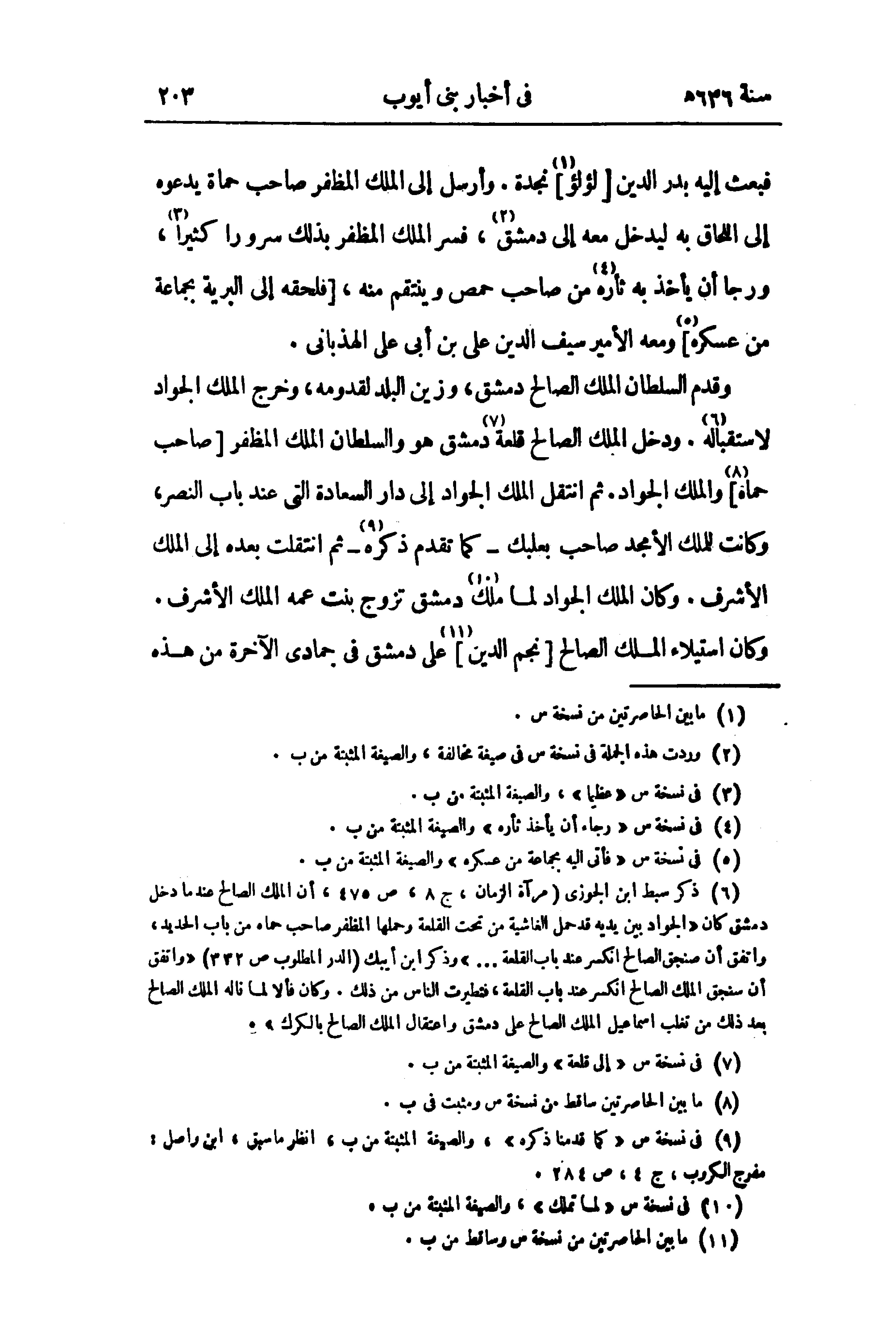 (¬6) ذكر سبط ابن الجوزى (مرآة الزمان، ج 8، ص 475، أن الملك الصالح عندما دخل دمشق كان «الجواد بين يديه قد حمل الغاشية من تحت القلعة وحملها المظفر صاحب حماه من باب الحديد، واتفق أن صنجق الصالح انكسر عند باب القلعة. . .» وذكر ابن أيبك (الدر المطلوب ص 332) «واتفق أن سنجق الملك الصالح انكسر عند باب القلعة، فتطيرت الناس من ذلك. وكان فألا لما ناله الملك الصالح بعد ذلك من تغلب اسماعيل الملك الصالح على دمشق واعتقال الملك الصالح بالكرك».
