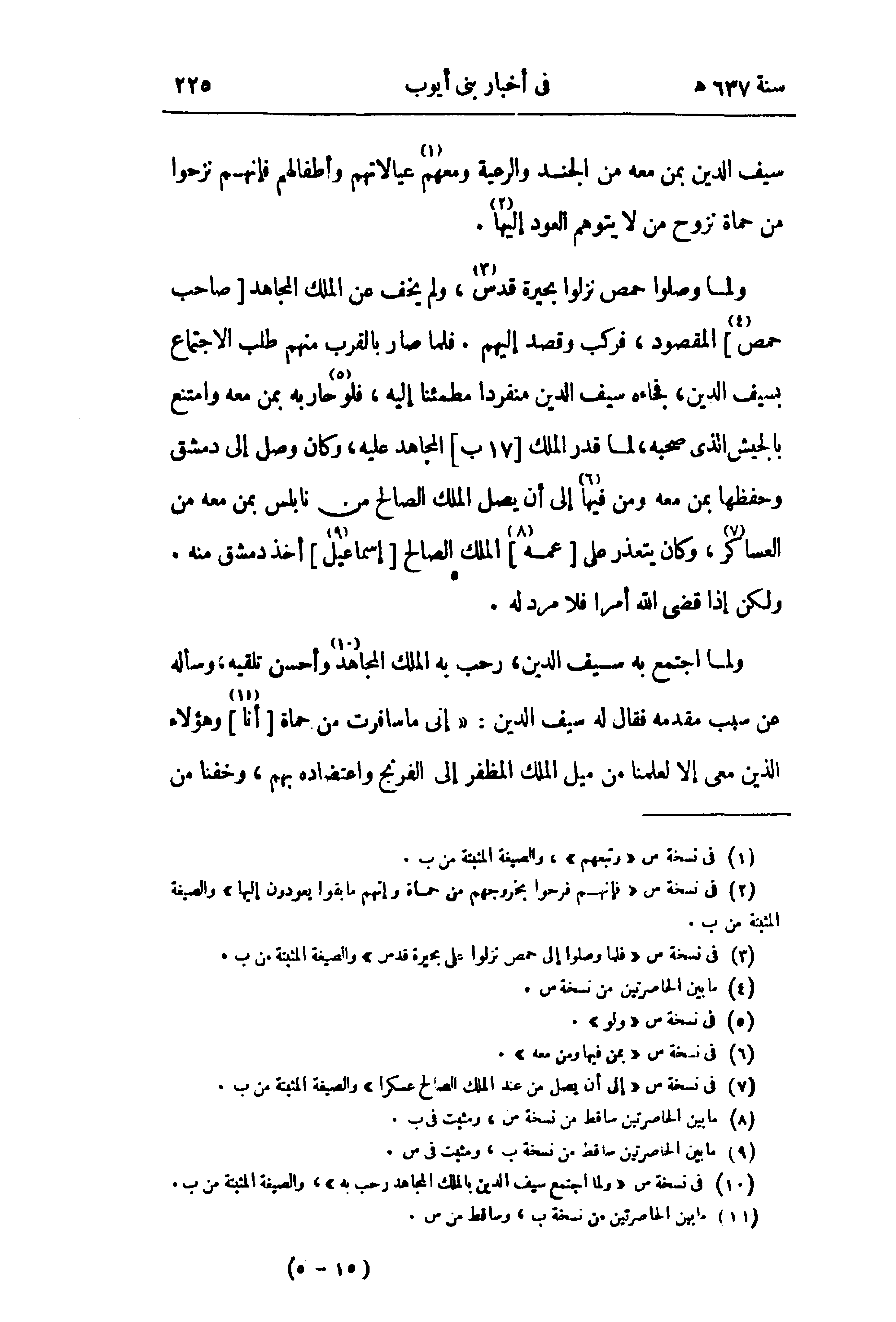 ولما وصلوا حمص نزلوا بحيرة قدس (¬3)، ولم يخف عن الملك المجاهد [صاحب حمص (¬4)] المقصود، فركب وقصد إليهم. فلما صار بالقرب منهم طلب الاجتماع بسيف الدين، فجاءه سيف الدين منفردا مطمئنا إليه، فلو (¬5) حاربه بمن معه وامتنع بالجيش الذى صحبه، لما قدر الملك [17 ب] المجاهد عليه، وكان وصل إلى دمشق وحفظها بمن معه ومن فيها (¬6) إلى أن يصل الملك الصالح من نابلس بمن معه من العساكر (¬7)، وكان يتعذر على [عمه (¬8)] الملك الصالح [إسماعيل (¬9)] أخذ دمشق منه.
