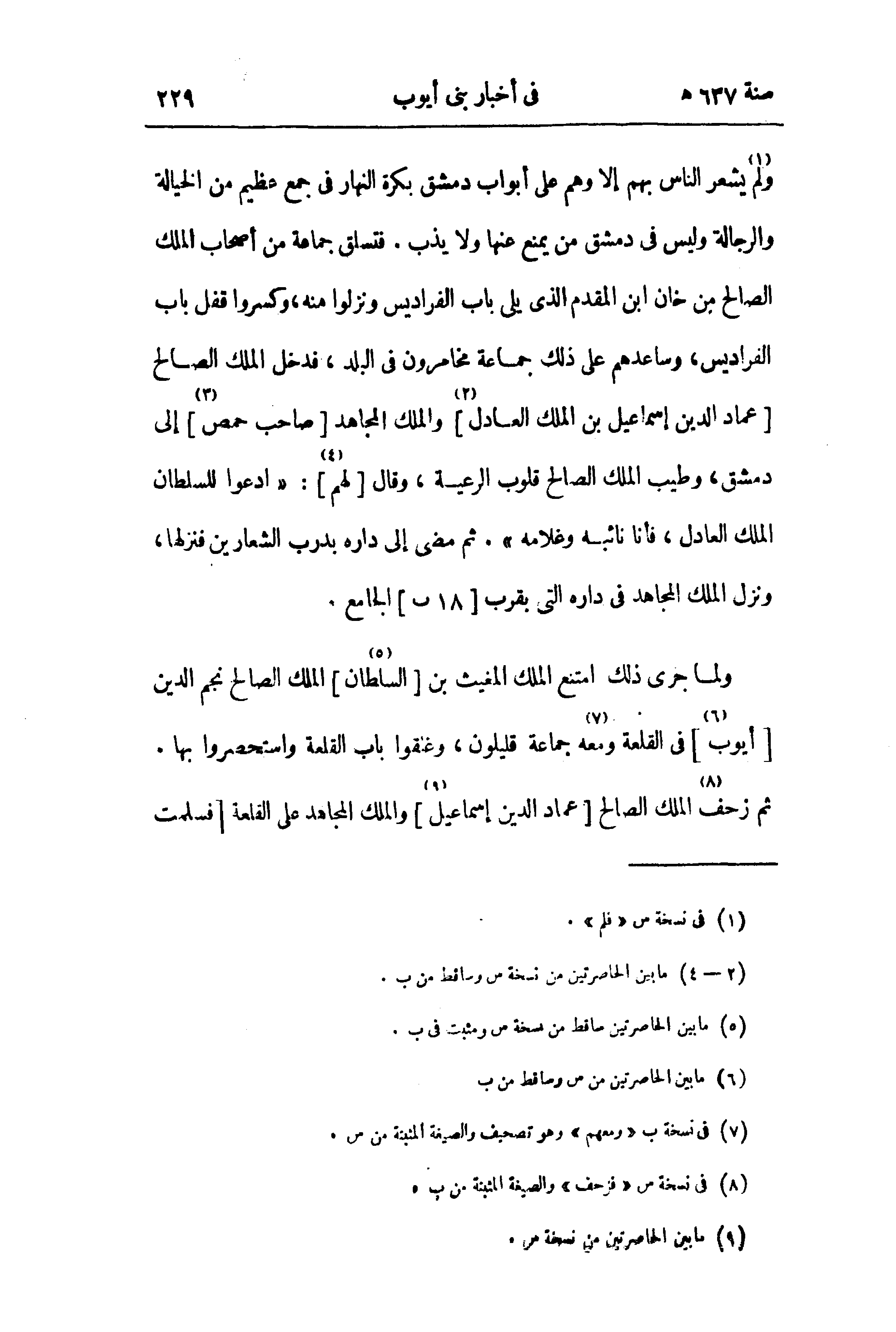 ولم (¬1) يشعر الناس بهم إلا وهم على أبواب دمشق بكرة النهار في جمع عظيم من الخيالة والرجالة وليس في دمشق من يمنع عنها ولا يذب. فتسلق جماعة من أصحاب الملك الصالح من خان ابن المقدم الذى يلى باب الفراديس ونزلوا منه، وكسروا قفل باب الفراديس، وساعدهم على ذلك جماعة مخامرون في البلد، فدخل الملك الصالح [عماد الدين إسماعيل بن الملك العادل (¬2)] والملك المجاهد [صاحب حمص (¬3)] إلى دمشق، وطيب الملك الصالح قلوب الرعية، وقال [لهم (¬4)]: «ادعوا للسلطان الملك العادل، فأنا نائبه وغلامه». ثم مضى إلى داره بدرب الشعارين فنزلها، ونزل الملك المجاهد في داره التي بقرب [18 ب] الجامع.