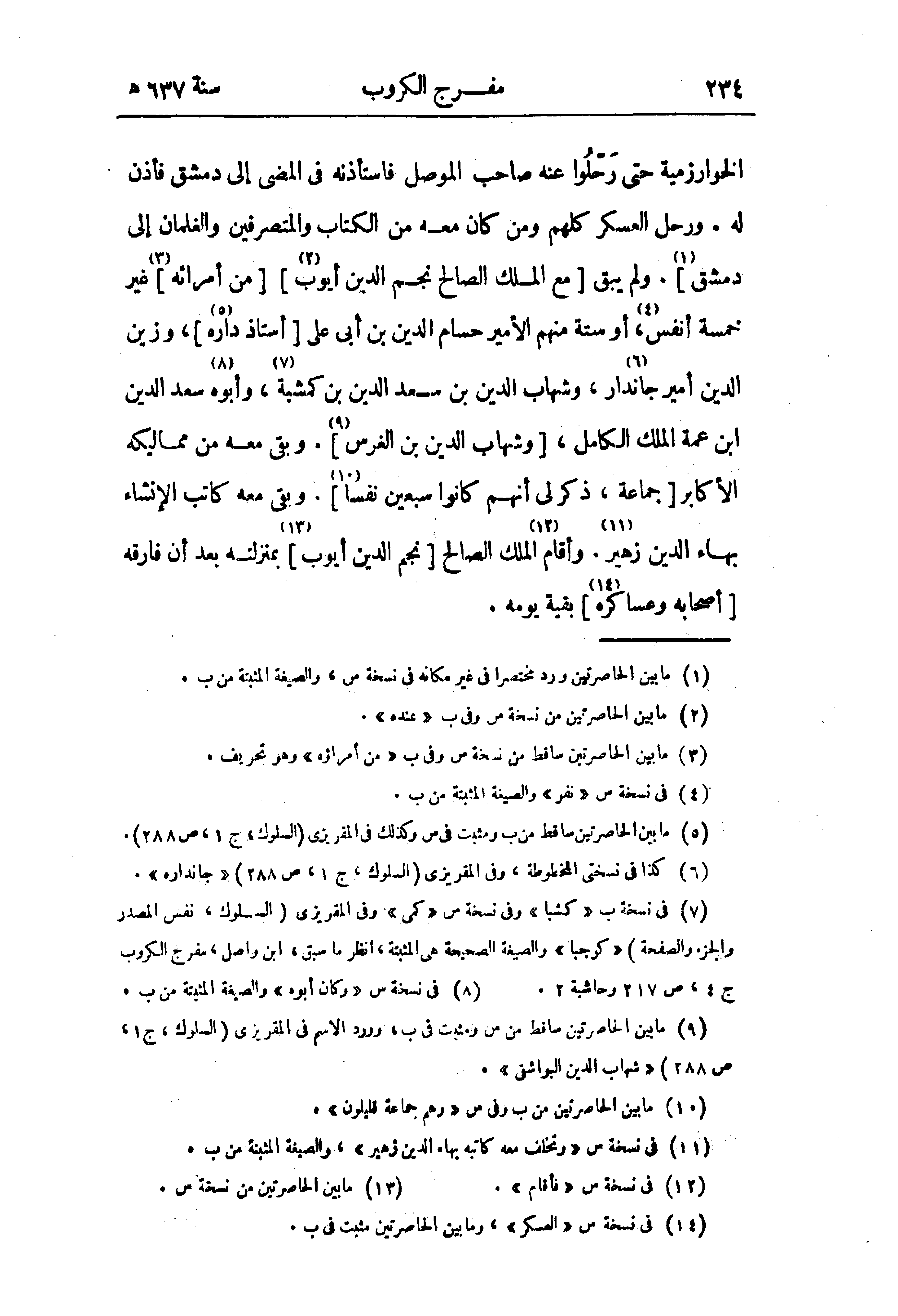 الخوارزمية حتى رحّلوا عنه صاحب الموصل فاستأذنه في المضى إلى دمشق فأذن له. ورحل العسكر كلهم ومن كان معه من الكتاب والمتصرفين والغلمان إلى دمشق] (¬1). ولم يبق [مع الملك الصالح نجم الدين أيوب (¬2)] [من أمرائه] (¬3) غير خمسة أنفس (¬4)، أو ستة منهم الأمير حسام الدين بن أبى على [أستاذ داره (¬5)]، وزين الدين أمير جاندار (¬6)، وشهاب الدين بن سعد الدين بن كمشبة (¬7)، وأبوه (¬8) سعد الدين ابن عمة الملك الكامل، [وشهاب الدين بن الغرس] (¬9). وبقى معه من مماليكه الأكابر [جماعة، ذكر لى أنهم كانوا سبعين نفسا (¬10)]. وبقى معه كاتب الإنشاء بهاء الدين زهير (¬11). وأقام (¬12) الملك الصالح [نجم الدين أيوب] (¬13) بمنزلته بعد أن فارقه [أصحابه وعساكره (¬14)] بقية يومه.