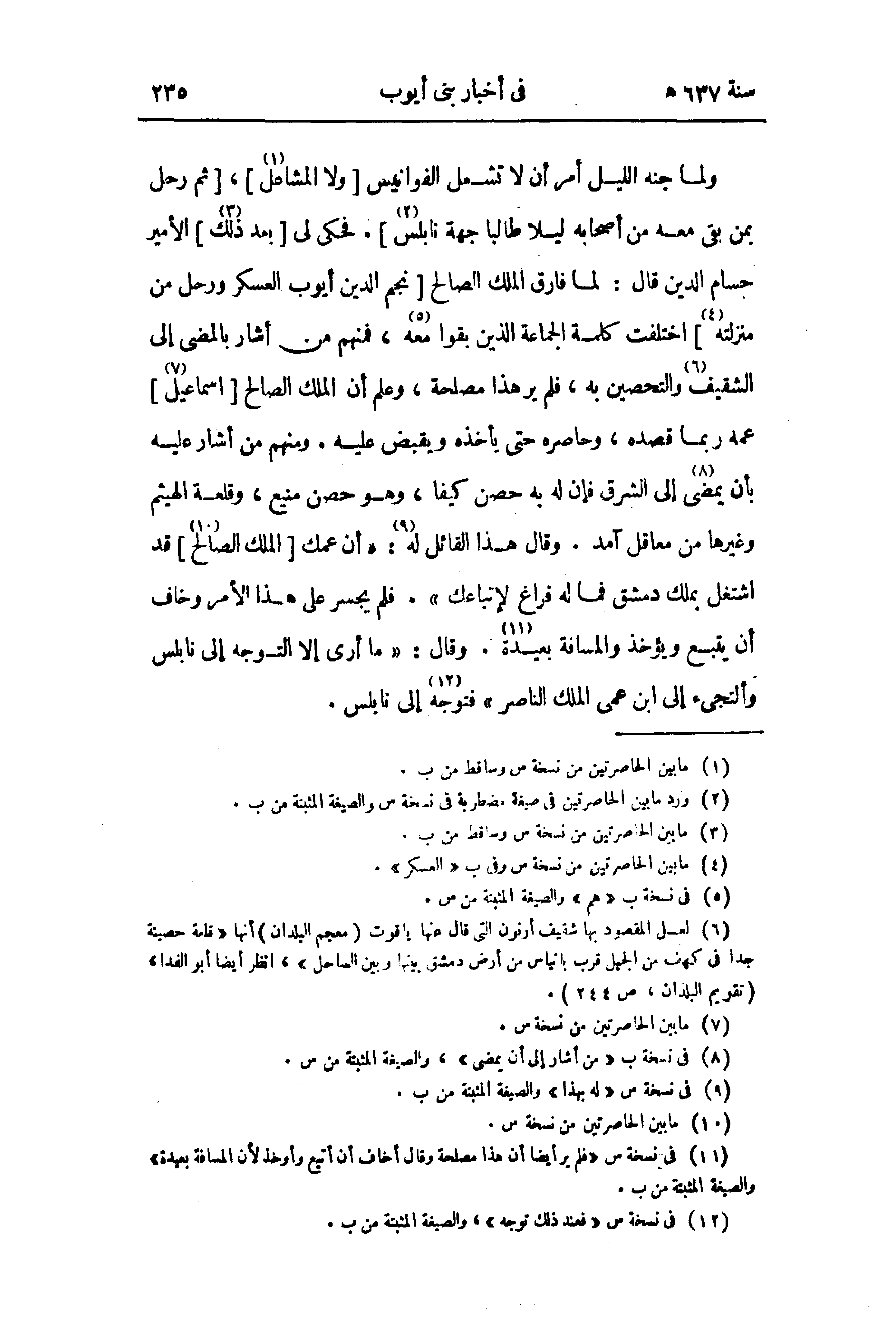 ولما جنه الليل أمر أن لا تشعل الفوانيس [ولا المشاعل (¬1)]، [ثم رحل بمن بقى معه من أصحابه ليلا طالبا جهة نابلس (¬2)]. فحكى لى [بعد ذلك (¬3)] الأمير حسام الدين قال: لما فارق الملك الصالح [نجم الدين أيوب العسكر ورحل من منزلته (¬4)] اختلفت كلمة الجماعة الذين بقوا معه (¬5)، فمنهم من أشار بالمضى إلى الشقيف (¬6) والتحصين به، فلم ير هذا مصلحة، وعلم أن الملك الصالح [اسماعيل (¬7)] عمه ربما قصده، وحاصره حتى يأخذه ويقبض عليه. ومنهم من أشار عليه بأن يمضى (¬8) إلى الشرق فإن له به حصن كيفا، وهو حصن منيع، وقلعة الهيثم وغيرها من معاقل آمد. وقال هذا القائل له (¬9): «أن عمك [الملك الصالح (¬10)] قد اشتغل بملك دمشق فما له فراغ لإتباعك». فلم يجسر على هذا الأمر وخاف أن يتبع ويؤخذ والمسافة بعيدة (¬11). وقال: «ما أرى إلا التوجه إلى نابلس وألتجىء إلى ابن عمى الملك الناصر» فتوجه (¬12) إلى نابلس.