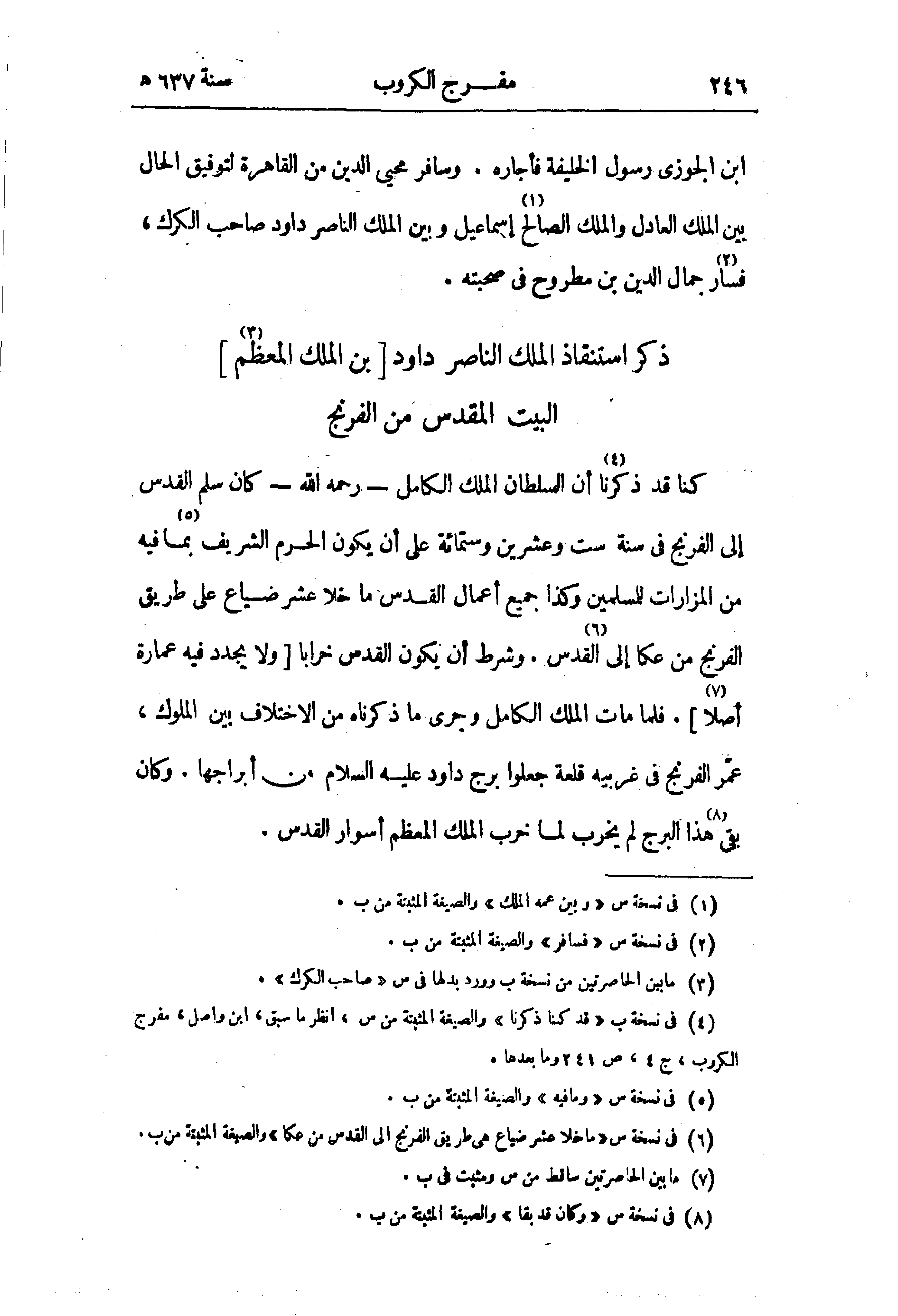 كنا قد ذكرنا (¬4) أن السلطان الملك الكامل - رحمه الله - كان سلم القدس إلى الفرنج في سنة ست وعشرين وستمائة على أن يكون الحرم الشريف (¬5) بما فيه من المزارات للمسلمين وكذا جميع أعمال القدس ما خلا عشر ضياع على طريق الفرنج من عكا إلى (¬6) القدس. وشرط أن يكون القدس خرابا [ولا يجدد فيه عمارة أصلا (¬7)]. فلما مات الملك الكامل وجرى ما ذكرناه من الاختلاف بين الملوك، عمّر الفرنج في غربيه قلعة جعلوا برج داود عليه السلام من أبراجها. وكان بقى (¬8) هذا البرج لم يخرب لما خرب الملك المعظم أسوار القدس.