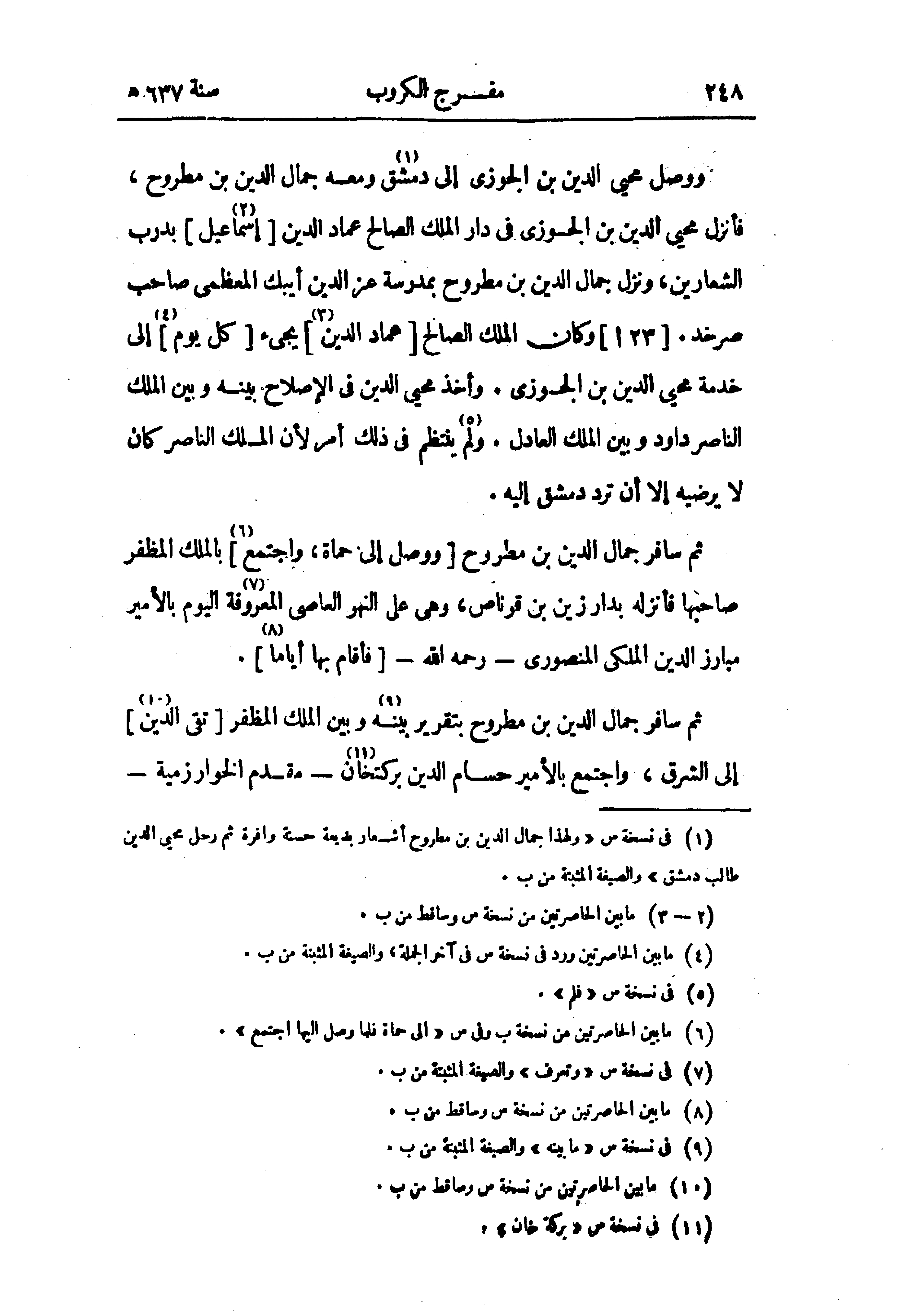 ووصل محيى الدين بن الجوزى إلى دمشق (¬1) ومعه جمال الدين بن مطروح، فأنزل محيى الدين بن الجوزى في دار الملك الصالح عماد الدين [إسماعيل (¬2)] بدرب الشعارين، ونزل جمال الدين بن مطروح بمدرسة عز الدين أيبك المعظمى صاحب صرخد. [23 ا] وكان الملك الصالح [عماد الدين (¬3)] يجىء [كل يوم] (¬4) إلى خدمة محيى الدين بن الجوزى. وأخذ محيى الدين في الإصلاح بينه وبين الملك الناصر داود وبين الملك العادل. ولم (¬5) ينتظم في ذلك أمر لأن الملك الناصر كان لا يرضيه إلا أن ترد دمشق إليه.
