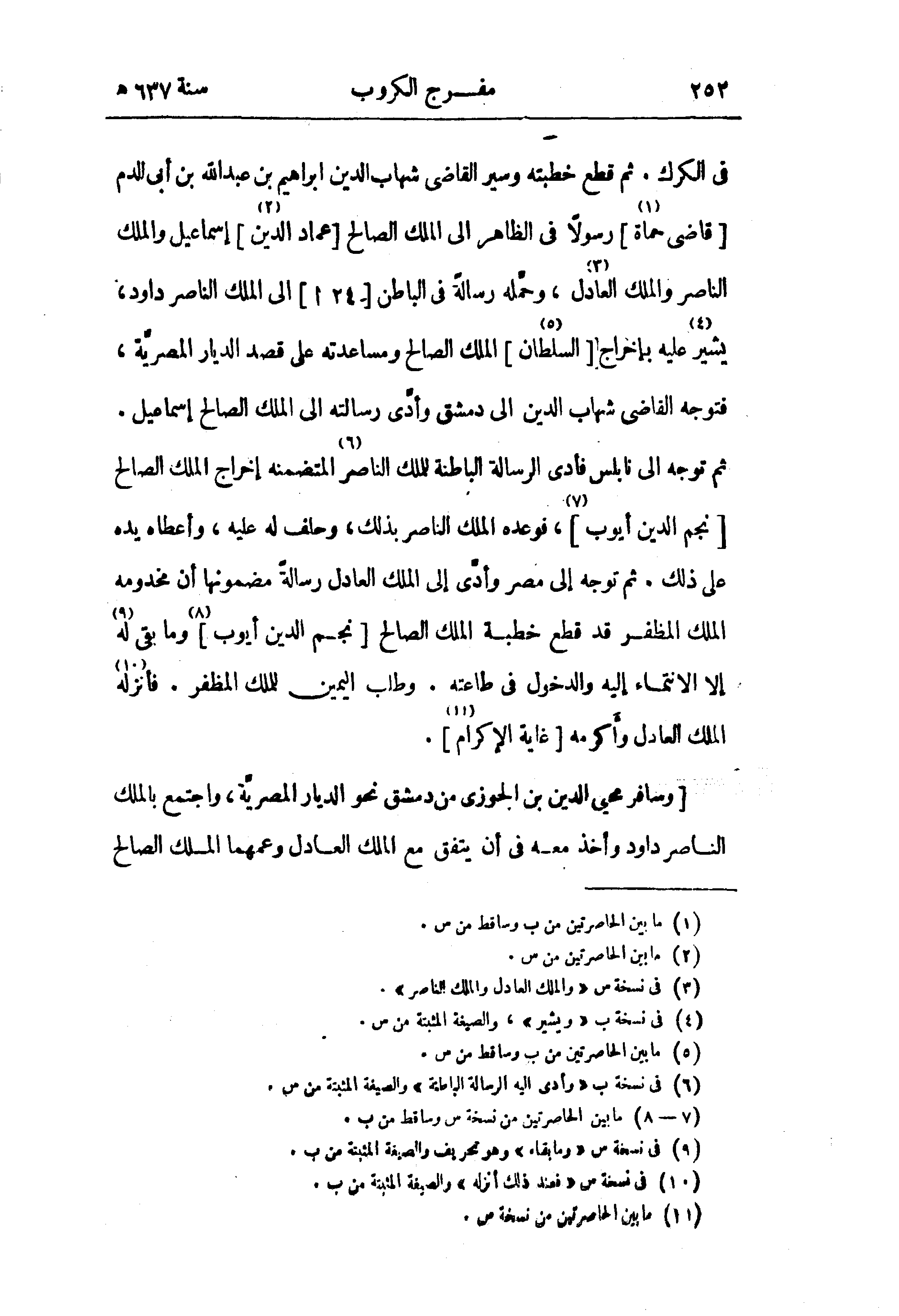 ثم توجه إلى نابلس فأدى الرسالة الباطنة للملك الناصر (¬6) المتضمنه إخراج الملك الصالح [نجم الدين أيوب] (¬7)، فوعده الملك الناصر بذلك، وحلف له عليه، وأعطاه يده على ذلك. ثم توجه إلى مصر وأدّى إلى الملك العادل رسالة مضمونها أن مخدومه الملك المظفر قد قطع خطبة الملك الصالح [نجم الدين أيوب] (¬8) وما بقى له (¬9) إلا الانتماء إليه والدخول في طاعته. وطلب اليمين للملك المظفر. فأنزله (¬10) الملك العادل وأكرمه [غاية الإكرام (¬11)].