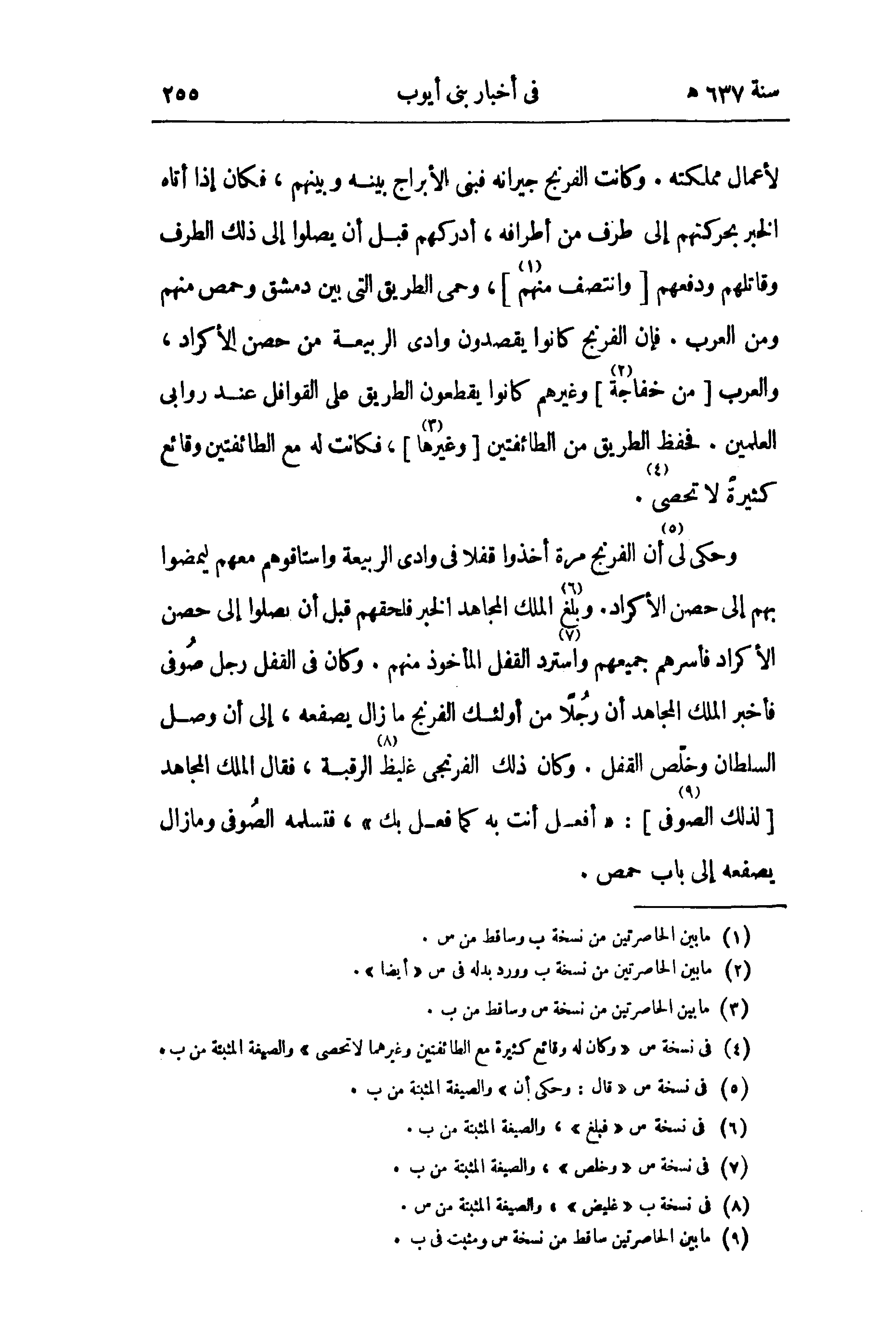 لأعمال مملكته. وكانت الفرنج جيرانه فبنى الأبراج بينه وبينهم، فكان إذا أتاه الخبر بحركتهم إلى طرف من أطرافه، أدركهم قبل أن يصلوا إلى ذلك الطرف وقاتلهم ودفعهم [وانتصف منهم (¬1)]، وحمى الطريق التي بين دمشق وحمص منهم ومن العرب. فإن الفرنج كانوا يقصدون وادى الربيعة من حصن الأكراد، والعرب [من خفاجة (¬2)] وغيرهم كانوا يقطعون الطريق على القوافل عند روابى العلمين. فحفظ الطريق من الطائفتين [وغيرها (¬3)]، فكانت له مع الطائفتين وقائع كثيرة لا تحصى (¬4).