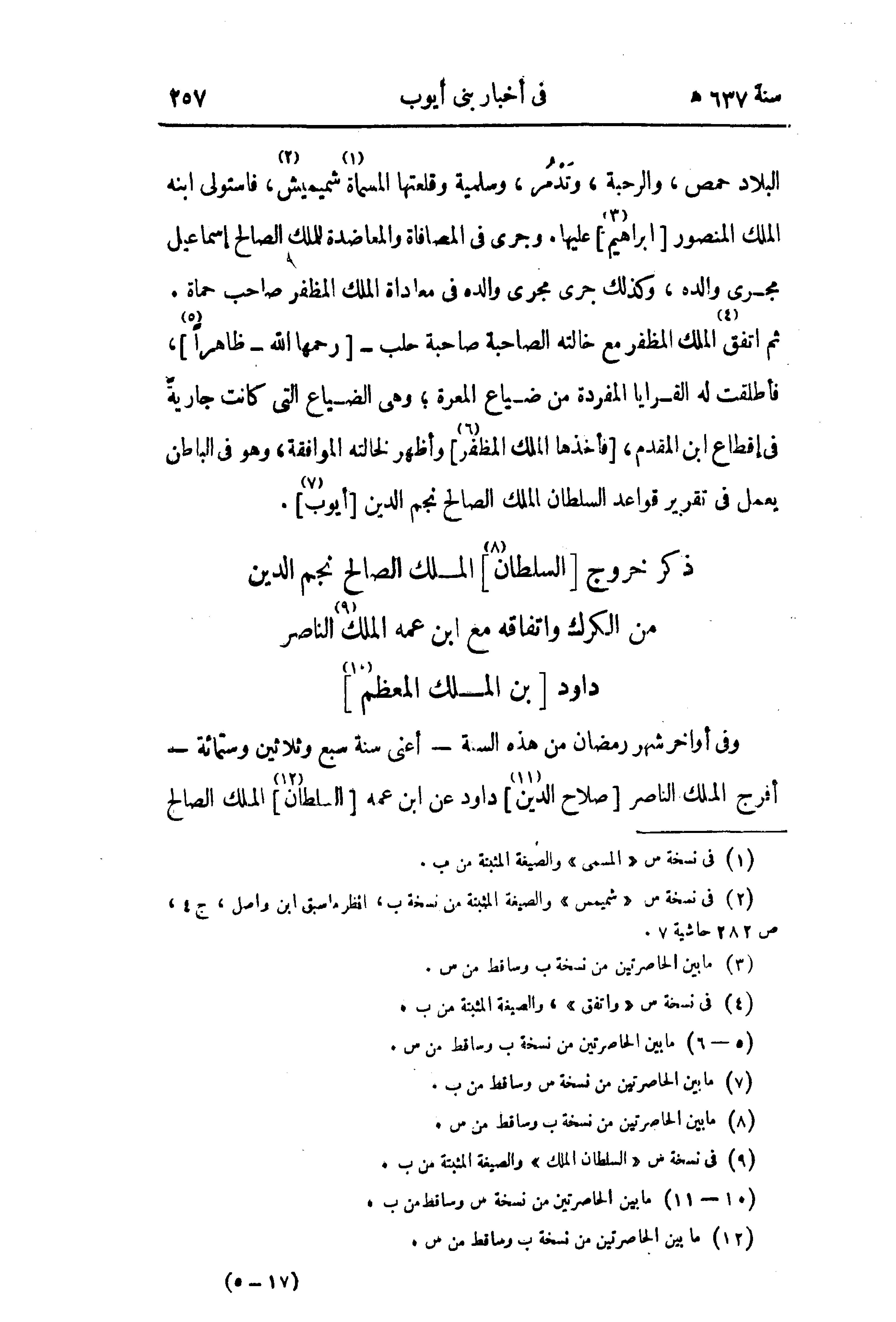 وفى أواخر شهر رمضان من هذه السنة - أعنى سنة سبع وثلاثين وستمائة - أفرج الملك الناصر [صلاح الدين (¬11)] داود عن ابن عمه [السلطان (¬12)] الملك الصالح