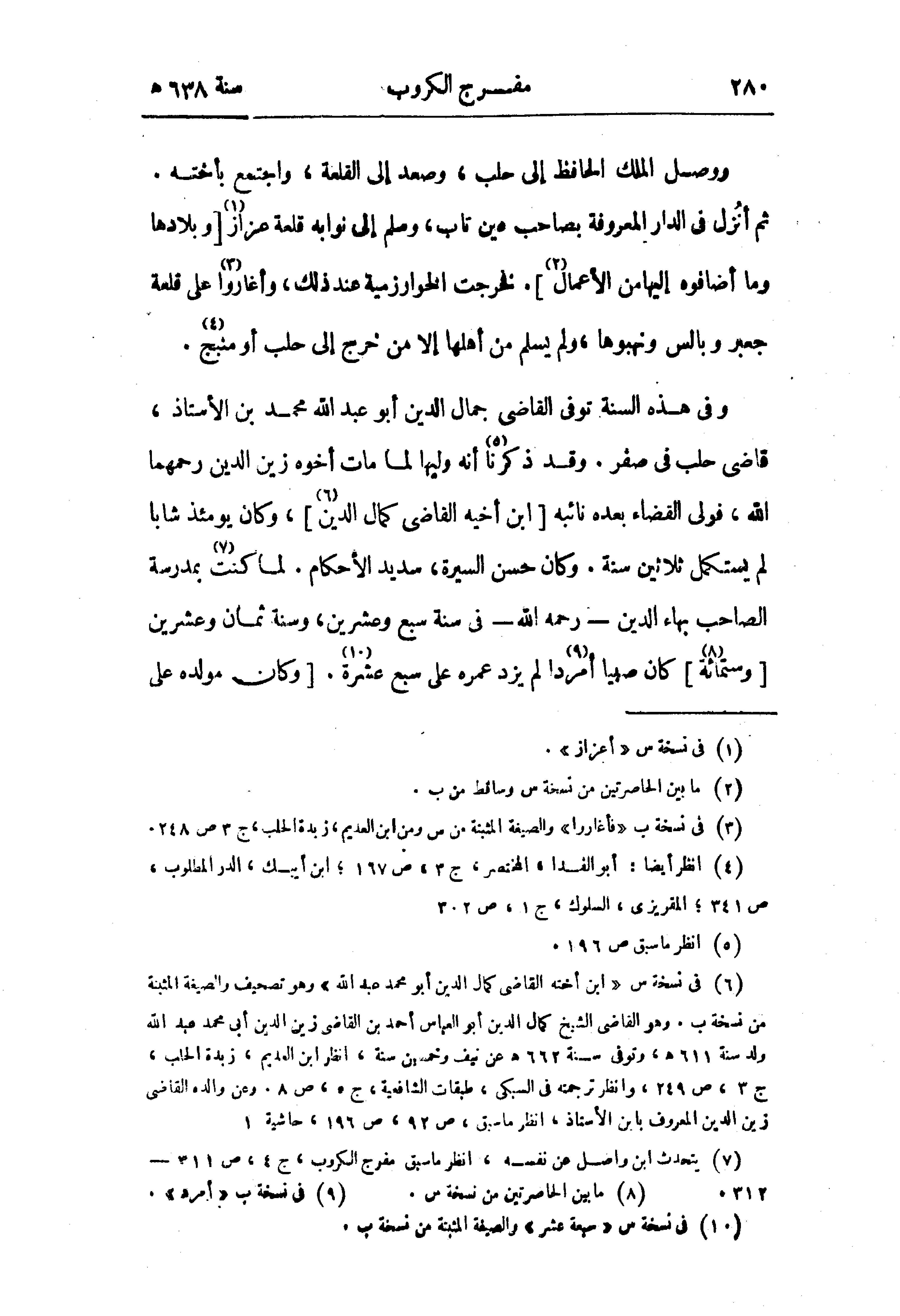 (¬6) في نسخة س «ابن أخته القاضى كمال الدين أبو محمد عبد الله» وهو تصحيف والصيغة المثبتة من نسخة ب. وهو القاضى الشيخ كمال الدين أبو العباس أحمد بن القاضى زين الدين أبى محمد عبد الله ولد سنة 611 هـ، وتوفى سنة 662 هـ عن نيف وخمسين سنة، انظر ابن العديم، زبدة الحلب، ج 3، ص 249، وانظر ترجمته في السبكى، طبقات الشافعية، ج 5، ص 8. وعن والده القاضى زين الدين المعروف بابن الأستاذ، انظر ما سبق، ص 92، ص 196، حاشية 1
