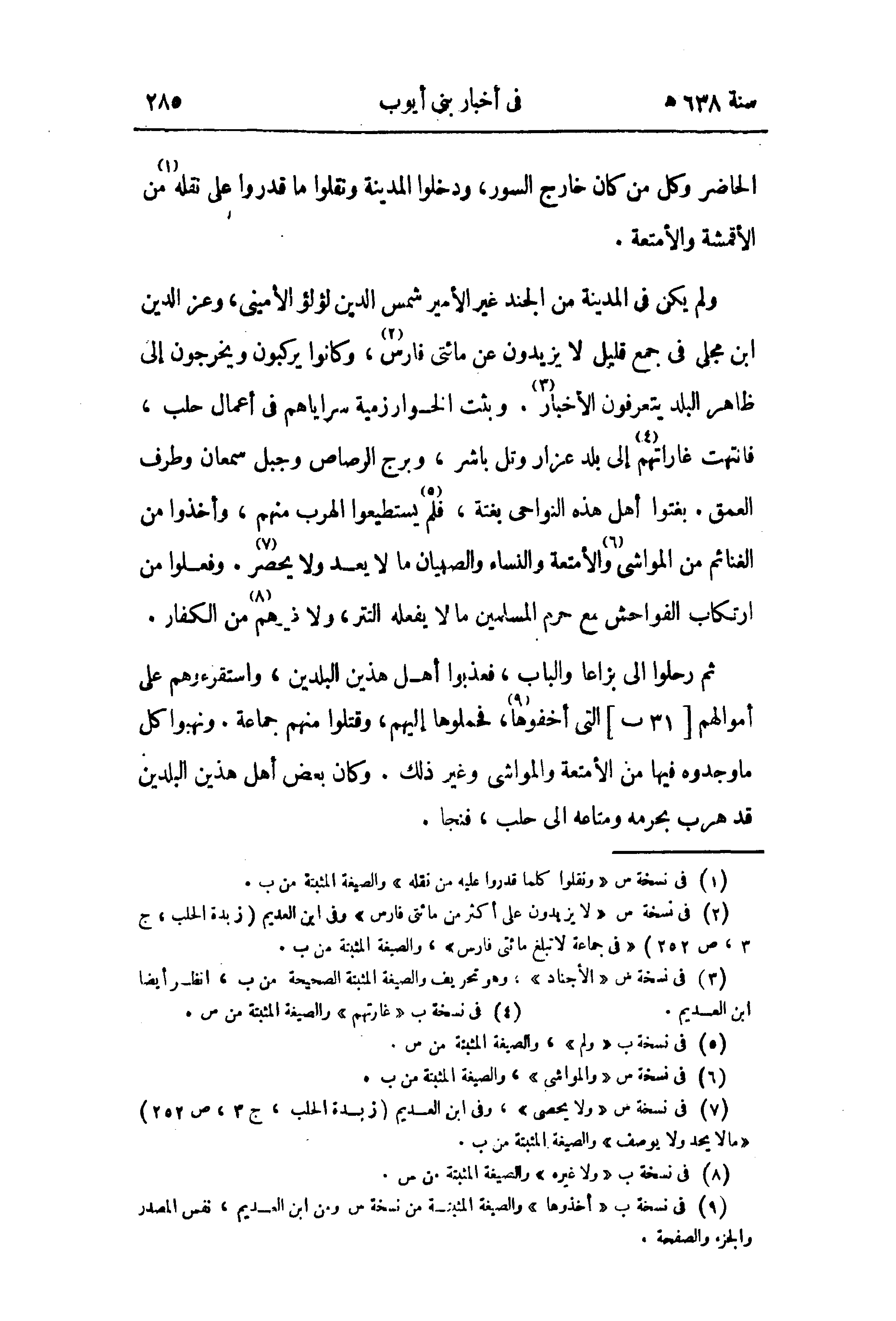 (¬2) في نسخة س «لا يزيدون على أكثر من مائتى فارس» وفى ابن العديم (زبدة الحلب، ج 3، ص 252) «في جماعة لا تبلغ مائتى فارس»، والصيغة المثبتة من ب.