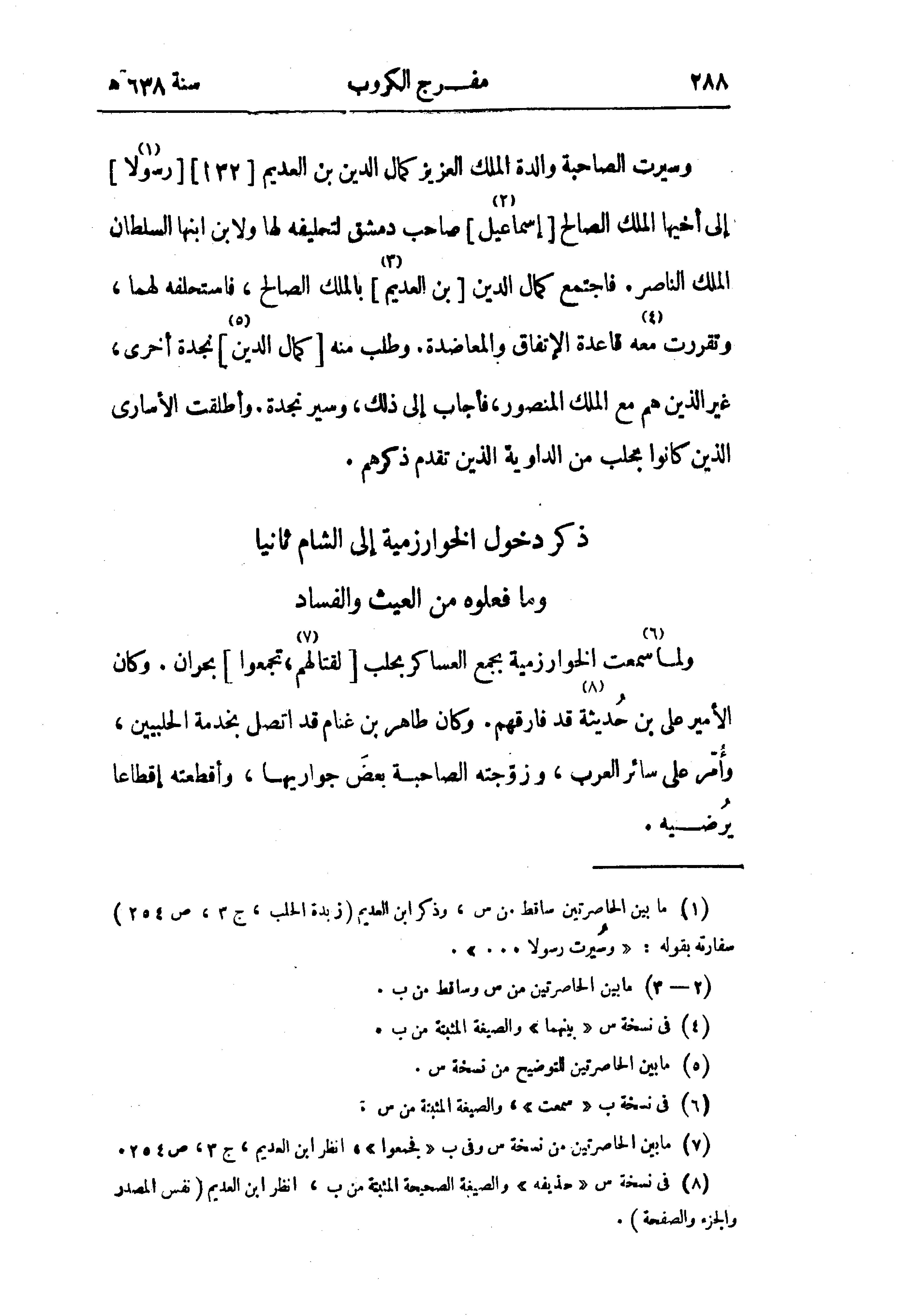 (¬1) ما بين الحاصرتين ساقط من س، وذكر ابن العديم (زبدة الحلب، ج 3، ص 254) سفارته بقوله: «وسيرت رسولا. . .».
