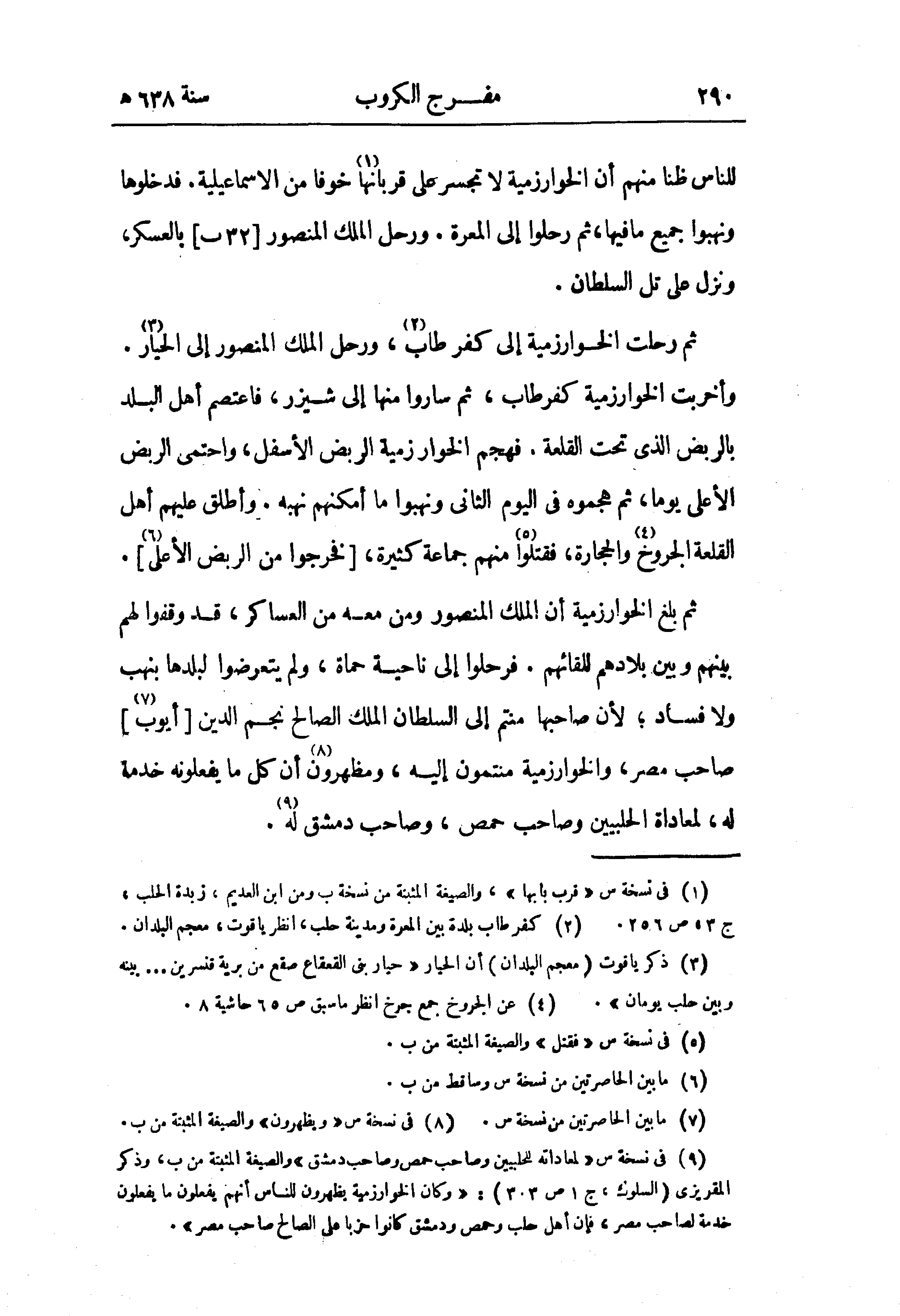 (¬9) في نسخة س «لمعاداته للحلبيين وصاحب حمص وصاحب دمشق» والصيغة المثبتة من ب، وذكر المقريزى (السلوك، ج 1 ص 303): «وكان الخوارزمية يظهرون للناس أنهم يفعلون ما يفعلون خدمة لصاحب مصر، فإن أهل حلب وحمص ودمشق كانوا حزبا على الصالح صاحب مصر».