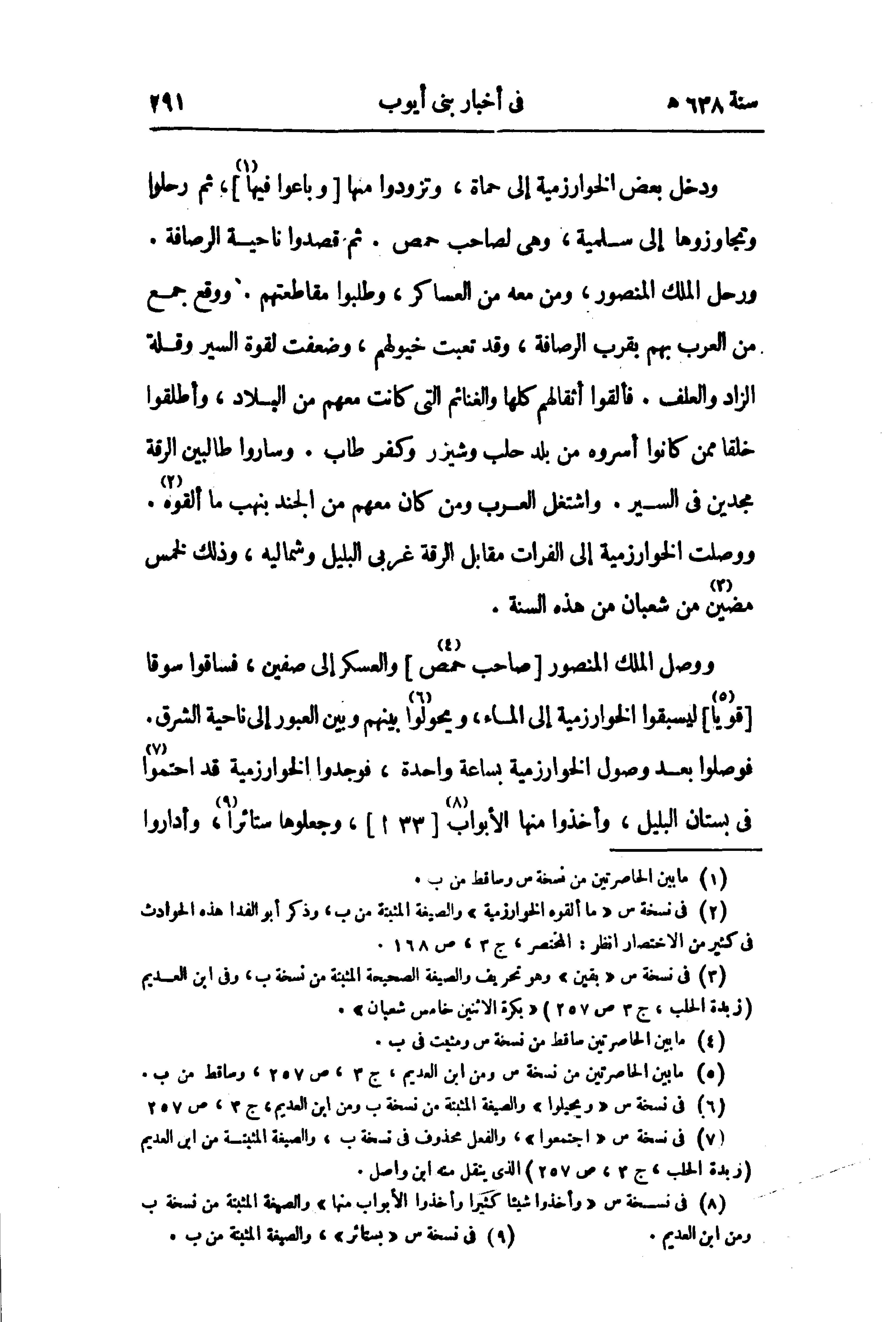 (¬2) في نسخة س «ما ألقوه الخوارزمية» والصيغة المثبتة من ب، وذكر أبو الفدا هذه الحوادث في كثير من الاختصار انظر: المختصر، ج 3، ص 168.