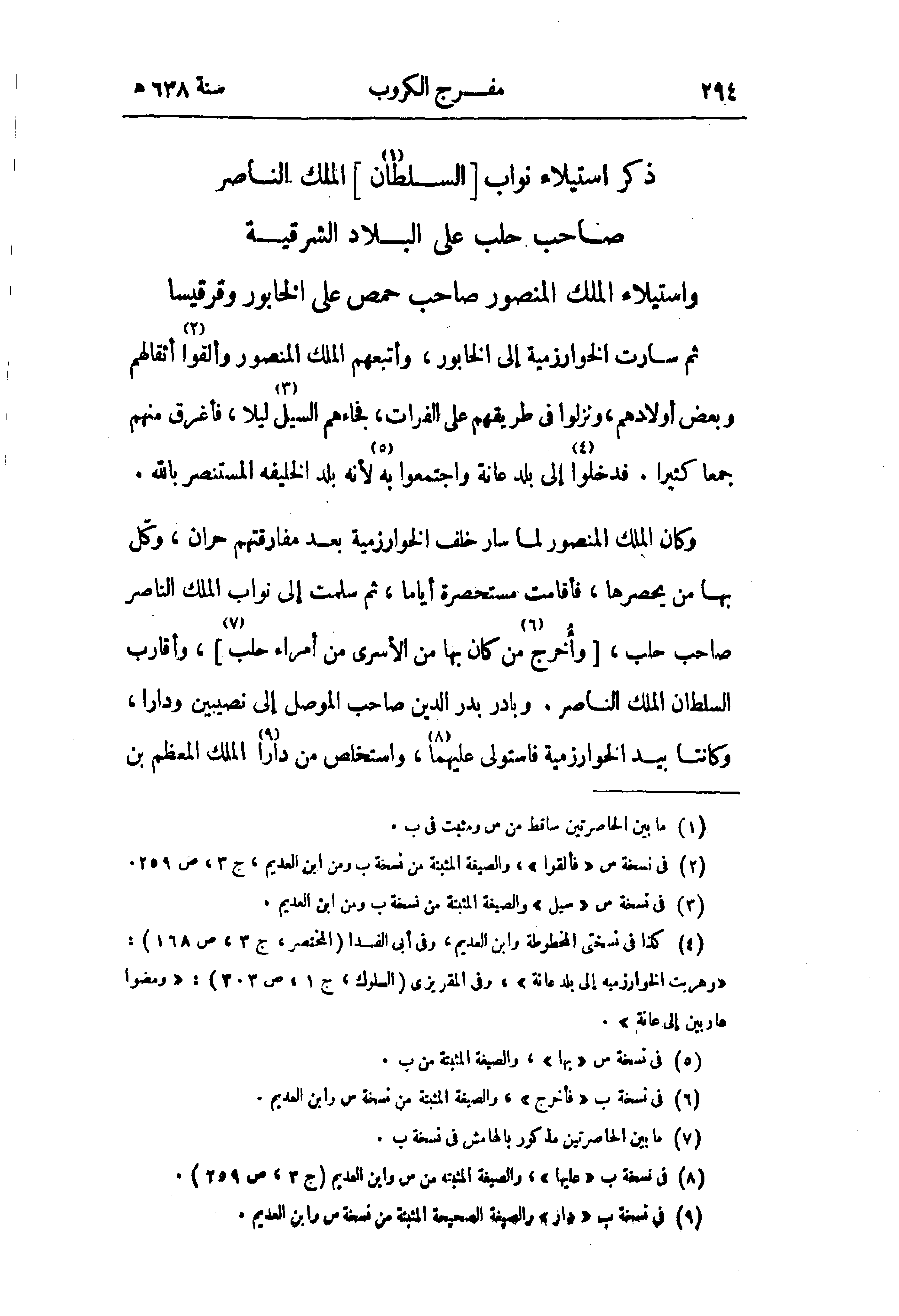 (¬4) كذا في نسختى المخطوطة وابن العديم، وفى أبى الفدا (المختصر، ج 3، ص 168): «وهربت الخوارزمية إلى بلد عانة»، وفى المقريزى (السلوك، ج 1، ص 303): «ومضوا هاربين إلى عانة».