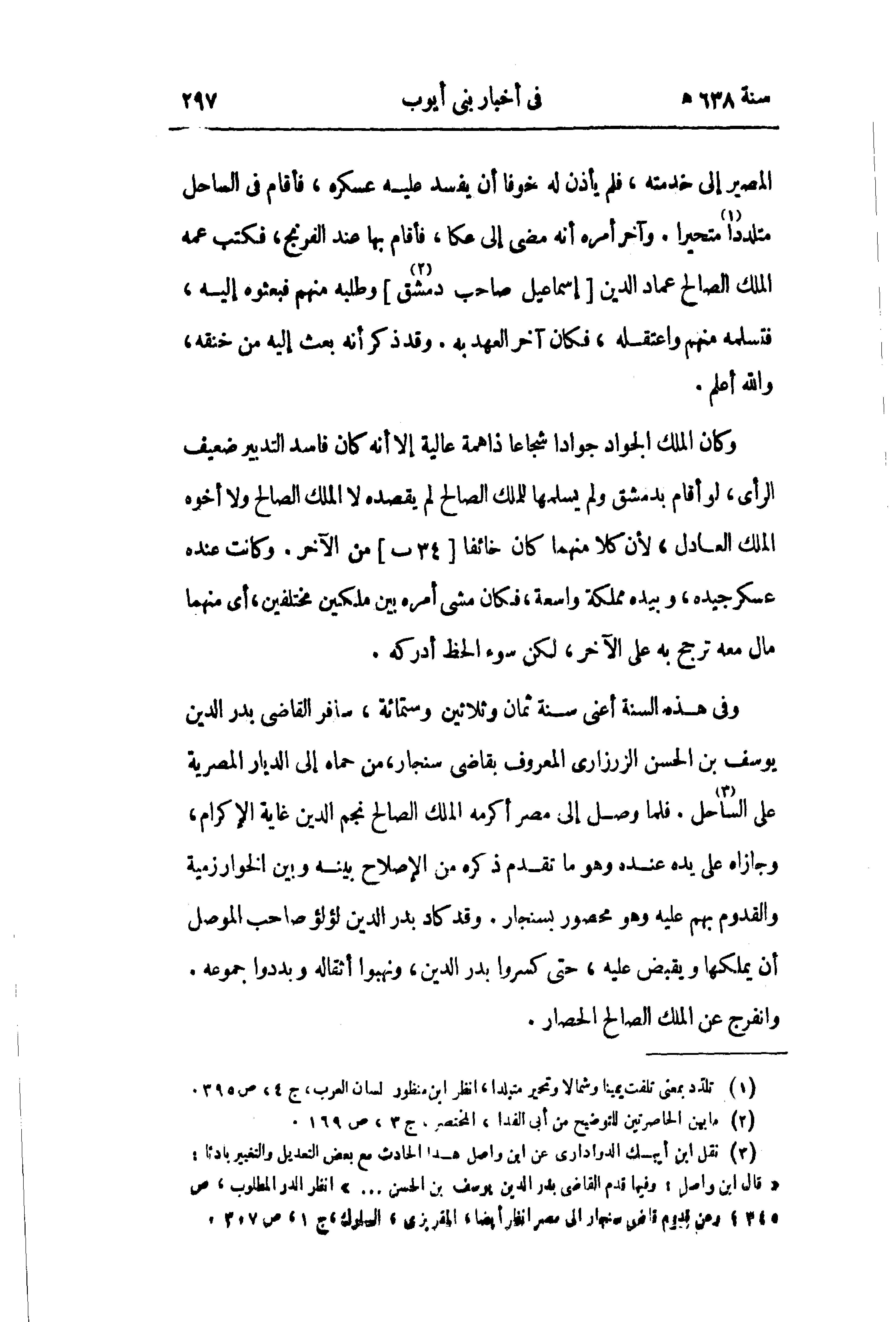(¬3) نقل ابن أيبك الدوادارى عن ابن واصل هذا الحادث مع بعض التعديل والتغيير بادئا: «قال ابن واصل: وفيها قدم القاضى بدر الدين يوسف بن الحسن. . .» انظر الدر المطلوب، ص 345؛ وعن قدوم قاضى سنجار إلى مصر انظر أيضا، المقريزى، السلوك، ج 1، ص 307.