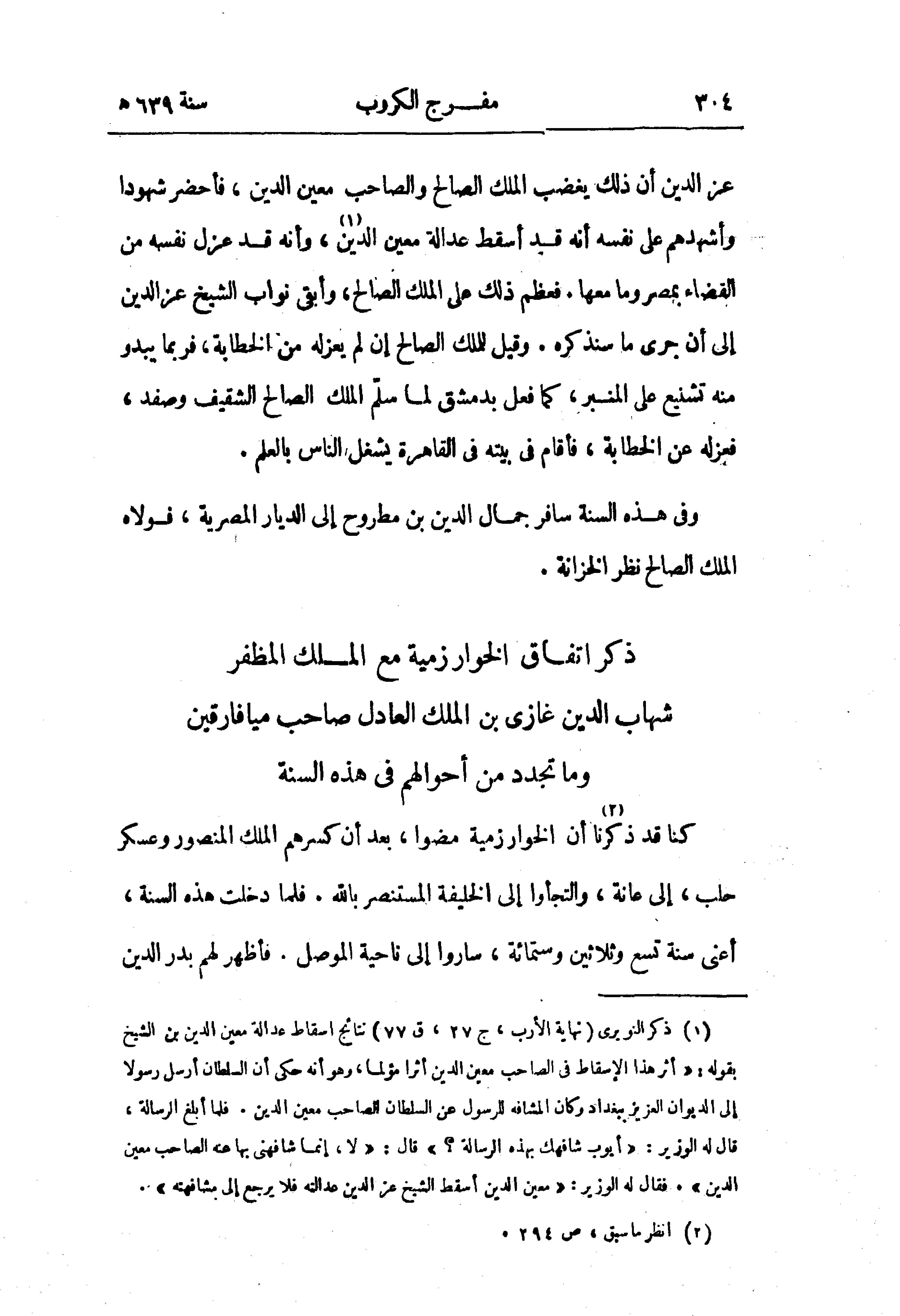 (¬1) ذكر النويرى (نهاية الأرب، ج 27، ق 77) نتائج اسقاط عدالة معين الدين بن الشيخ بقوله: «أثر هذا الإسقاط في الصاحب معين الدين أثرا مؤلما، وهو أنه حكى أن السلطان أرسل رسولا إلى الديوان العزيز ببغداد وكان المشافه للرسول عن السلطان الصاحب معين الدين. فلما أبلغ الرسالة، قال له الوزير: «أيوب شافهك بهذه الرسالة؟» قال: «لا، إنما شافهنى بها عنه الصاحب معين الدين». فقال له الوزير: «معين الدين أسقط الشيخ عز الدين عدالته فلا يرجع إلى مشافهته».