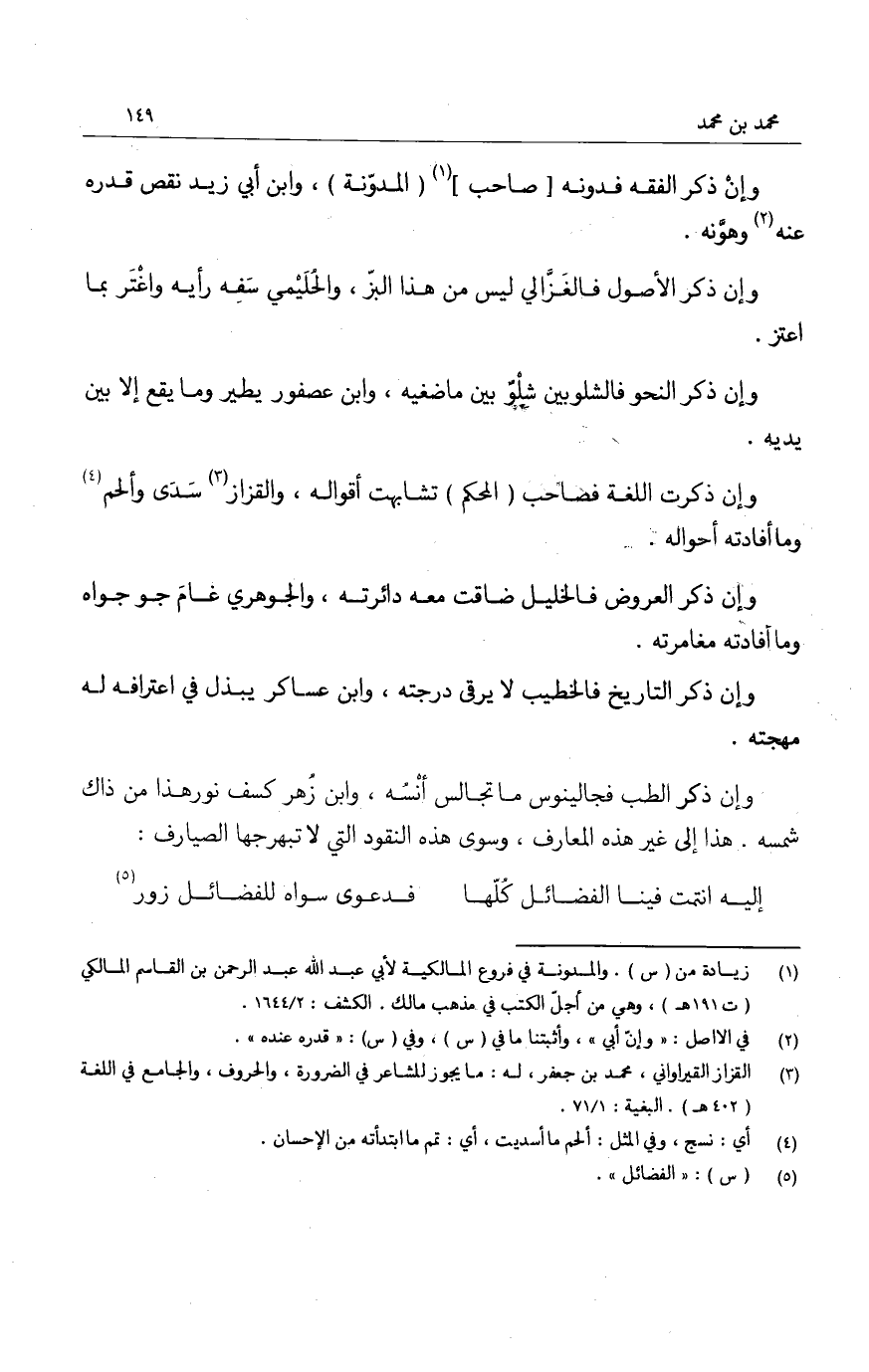 وإن ذكرت اللغة فصاحب المحكم تشابهت أقواله، والقزاز سَدى وألحم وما أفادته أحواله.