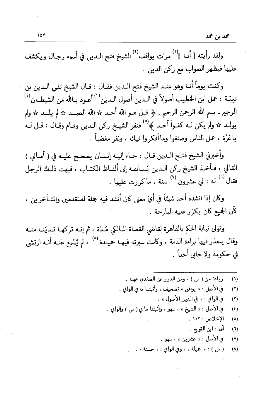 وكنت يوماً أنا وهو عند الشيخ فتح الدين فقال: قال الشيخ تقي الدين بن تيمية: عمل ابن الخطيب أصولاً في الدين أصول الدين أعوذ بالله من الشيطان الرجيم - بسم الله الرحمن الرحيم - " قل هو الله أحد الله الصمد لم يلد ولم يولد ولم يكن له كفواً أحد " فنفر الشيخ ركن الدين وقام وقال: قل له يا عُرّة، عمل الناس وصنفوا وما أفكروا فيك، ونفر مغضباً.