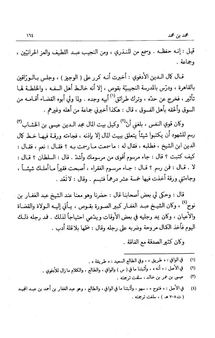 وكان قوي النفس، بلغني أن وكيل بيت المال مجد الدين عيسى بن الخشاب رسم للشهود أن يكتبوا شيئاً يتعلق ببيت المال إلا بإذنه، فجاءته ورقة فيها خط كمال الدين ابن الشيخ، فطلبه، فقال له: ما سمعت ما رسمت به؟ فقال: نعم، فقال: كيف كتبت؟ قال: جاء مرسوم أقوى من مرسومك وأشدّ. قال: السلطان؟ قال: لا. قال: فمن رسم؟ قال: جاء مرسوم الفقراء، أصبحت فقيراً ما أملك شيئاً، وجاءتني ورقة أخذت فيها خمسة عشر درهماً فتبسم. وقال: لا تَعُد.
