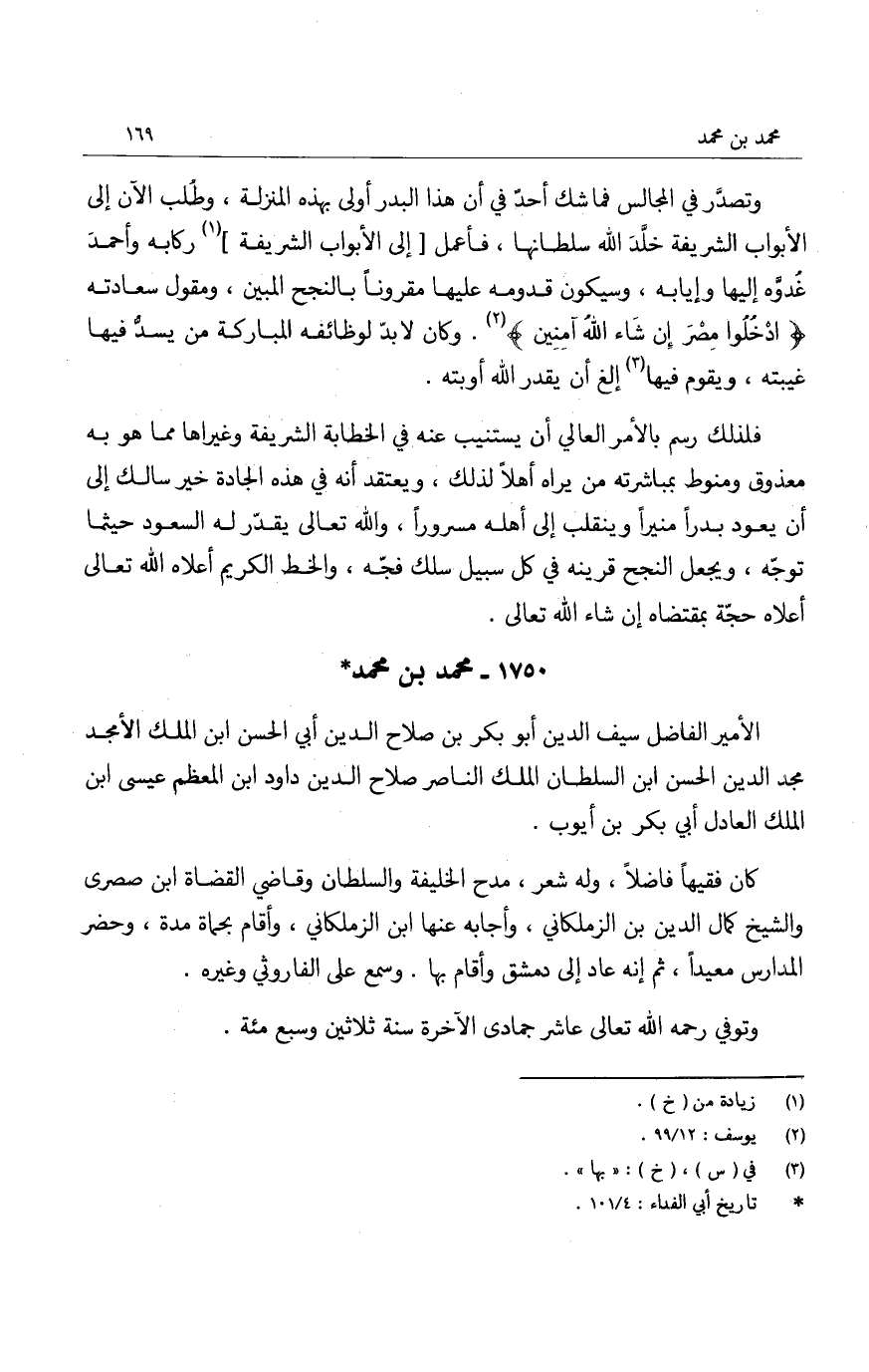 وتصدّر في المجالس فما شك أحدٌ في أن هذا البدر أولى بهذه المنزلة، وطُلب الآن الى الأبواب الشريفة خلّد الله سلطانها، فأعمل الى الأبواب الشريفة ركابه وأحمدَ غُدوَّه إليها وإيابه، وسيكون قدومه عليها مقروناً بالنجح المبين، ومقول سعادته " ادخُلوا مصر إن شاء الله آمنين ".وكان لابد لوظائفه المباركة من يسدّ فيها غيبته، ويقوم فيها إلى أن يقدر الله أوبته.