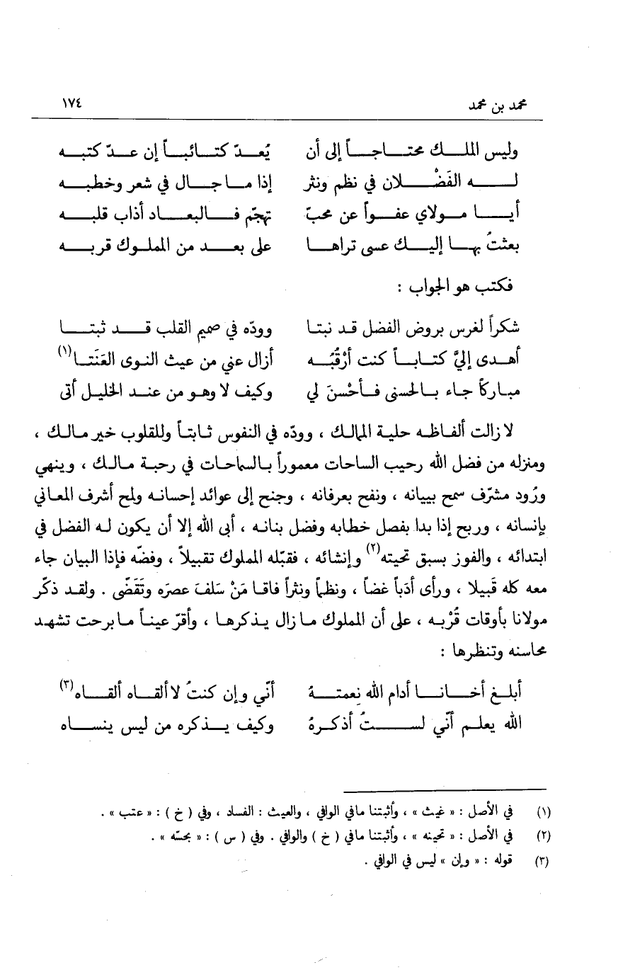 لا زالت ألفاظه حلية الممالك، وودّه في النفوس ثابتاً وللقلوب خير مالك، ومنزله من فضل الله رحيب الساحات معموراً بالسماحات في رحبة مالك، وينهي ورود مشرّف سمح ببيانه، ونفح بعرفانه، وجنح الى عوائد إحسانه ولمح أشرف المعاني بإنسانه، وربح إذا بدا بفصل خطابه وفضل بنانه، أبى الله إلا أن يكون له الفضل في ابتدائه، والفوز بسبق تحيته وإنشائه، فقبّله المملوك تقبيلاً، وفضّه فإذا البيان جاء معه كان قَبيلا، ورأى أدباً غضاً، ونظماً ونثراً فاقا مَن سلفَ عصرَه وتقضّى. ولقد ذكر مولانا بأوقات قُربه، على أن المملوك ما زال يذكرها، وأقرّ عيناً ما برحت تشهد محاسنه وتنظرها: