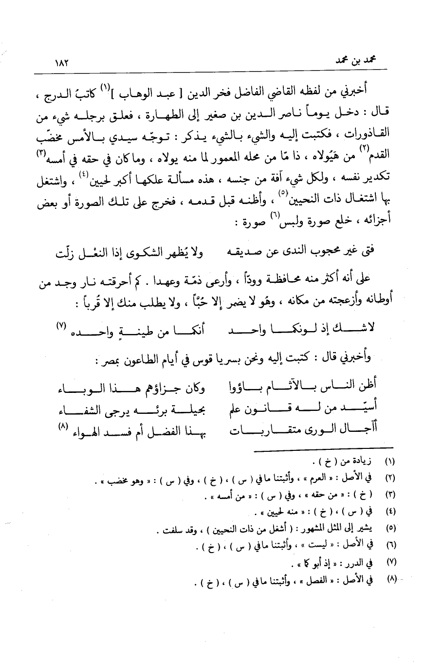 أخبرني من لفظه القاضي الفاضل فخر الدين عبد الوهاب كاتبُ الدرج، قال: دخل يوماً ناصر الدين بن صغير الى الطهارة، فعلم برجله شيء من القاذورات، فكتبت إليه والشيء بالشيء يذكر: توجه سيدي بالأمس مخضّب القدم من هَيولاه، ذا مّا من محله المعمور لما منه يولاه، وما كان في حقه في أمسه تكدير نفسه، ولكل شيء آفة من جنسه، هذه مسألة علكها أكبر لحيين، واشتغل بها اشتغال ذات النحيين، وأظنه قبل قدمه، فخرج على تلك الصورة أو بعض أجزائه، خلع صورة ولبس صورة: