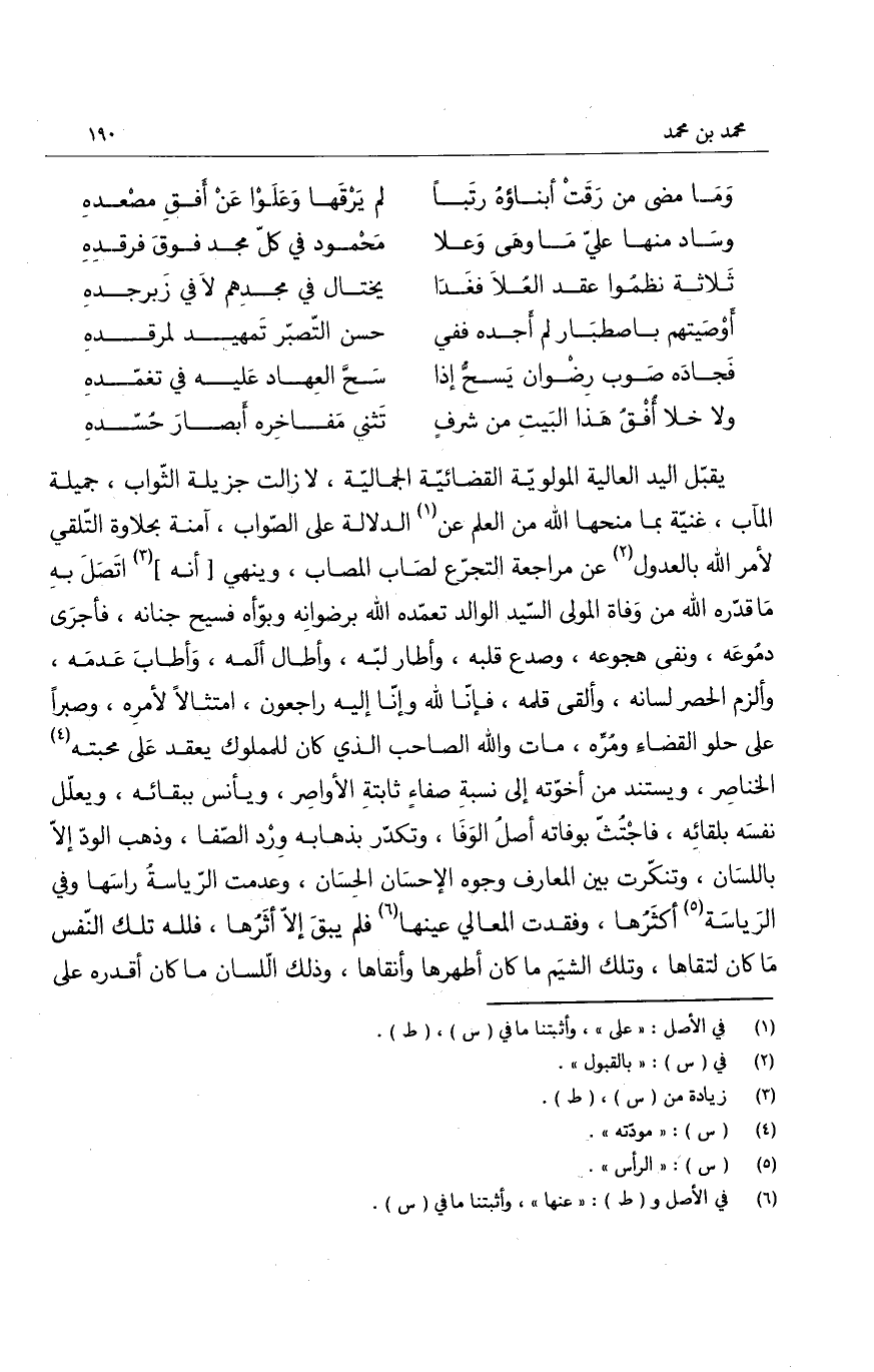 يقبّل اليد العالية المولوية القضائية الجمالية، لا زالت جزيلة الثواب، جميلة المآب، غنيّة بما منحها الله من العلم عن الدلالة على الصواب، آمنة بحلاوة التلقّي لأمر الله بالعدول عن مراجعة التجرّع لصاب المصاب، وينهي أنه اتصل به ما قدّره الله من وفاة المولى السيد الوالد تعمّده الله برضوانه وبوّأه فسيح جنانه، فأجرى دموعه، ونفى هجوعه، وصدع قلبه، وأطار لبّه، وأطال ألَمه، وأطابَ عدمَه، وألزم الحصر لسانه، وألقى قلمه، فإنّا لله وإنا إليه راجعون، امتثالاً لأمره، وصبراً على حلو القضاء ومرّه، مات والله الصاحب الذي كان للمملوك يعقد على محبته الخناصر، ويستند من أخوّته الى نسبة صفاءٍ ثابتة الأواصر، ويأنس ببقائه، ويعلل نفسه بلقائه، فاجْتُثّ بوفاته أصلُ الوفا، وتكدّر بذهابه وِرد الصّفا، وذهب الودّ إلا باللسان، وتنكّرت بين المعارف وجوه الإحسان الحِسان، وعدمت الرّياسةُ راسَها وفي الرياسة أكثرها، وفقدت المعالي عينها فلم يبقَ إلا أثرُها، فلله تلك النفس ما كان لتقاها، وتلك الشيم ما كان أطهرها وأنقاها، وذلك اللسان ما كان أقدره على