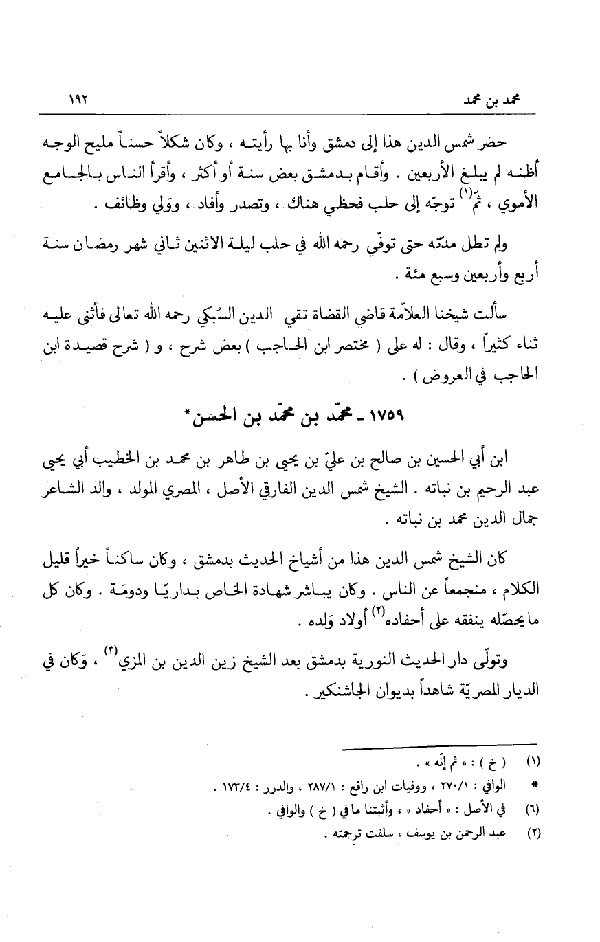 حضر شمس الدين هذا الى دمشق وأنا بها رأيته، وكان شكلاً حسناً مليح الوجه أظنه لم يبلغ الأربعين. وأقام بدمشق بعض سنة أو أكثر، وأقرأ الناس بالجامع الأموي، ثم توجه الى حلب فحظي هناك، وتصدر وأفاد، وولي وظائف.