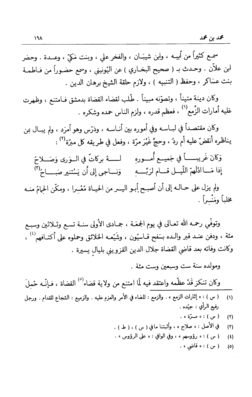 وكان دينه متيناً، وتصوّنه مبيناً. طُلب لقضاء القضاة بدمشق فامتنع، وظهرت عليه أمارات الزَّمع، فعظم قدره، ولزم الناس حمده وشكره.