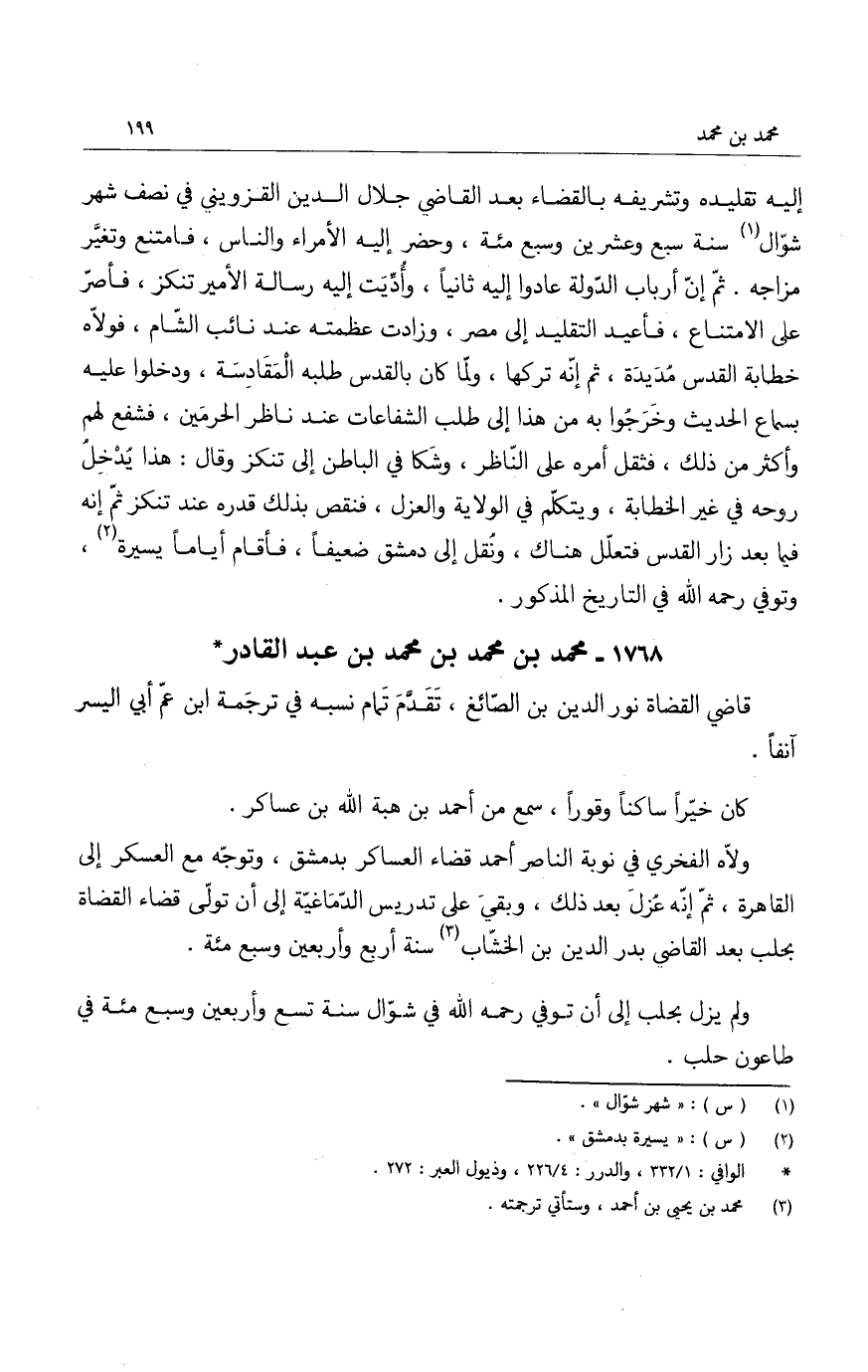 إليه تقليده وتشريفه بالقضاء بعد القاضي جلال الدين القزويني في نصف شهر شوال سنة سبع وعشرين وسبع مئة، وحضر إليه الأمراء والناس، فامتنع وتغيّر مزاجه. ثم إن أرباب الدولة عادوا إليه ثانياً، وأدّيت إليه رسالة الأمير تنكز، فأصرّ على الامتناع، فأعيد التقليد الى مصر، وزادت عظمته عند نائب الشام، فولاه خطابة القدس مُديدة، ثم إنه تركها، ولما كان بالقدس طلبه المَقادسة، ودخلوا عليه بسماع الحديث وخرجوا من هذا الى طلب الشفاعات عند ناظر الحرمين، فشفع لهم وأكثر من ذلك، فثقل أمره على الناظر، وشكا في الباطن الى تنكز وقال: هذا يُدخل روحه في غير الخطابة، ويتكلم في الولاية والعزل، فنقص بذلك قدره عند تنكز ثم إنه فيما بعد زار القدس فتعلل هناك، ونُقل الى دمشق ضعيفاً، فأقام أياماً يسيرة، وتوفي رحمه الله في التاريخ المذكور.