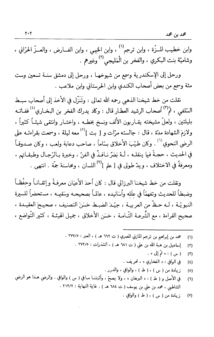 نقلت من خط شيخنا الذهبي رحمه الله تعالى: وتنزّل في الأخذ الى أصحاب سبط السلفي، ثم أصحاب الرشيد العطار قال: وكاد يدرك الفخر بن البخاري ففاته بليلتين، ولعل مشيخته يقاربون الألف ونسخ بخطه، واختار وانتقى شيئاً كثيراً، ولازم الشهادة مدة، قال: جالسته مرات وبت معه ليلة، وسمعت بقراءته على الرضى النحوي. وكان طيب الأخلاق بسّاماً، صاحب دعابة ولعب، وكان صدوقاً في الحديث، حجةً فيما ينقله، له بصرٌ نافذٌ في الفن، وخبرة بالرجال وطبقاتهم، ومعرفة في الاختلاف، ويدٌ طولى في علم اللسان ومحاسنة جمة. انتهى.
