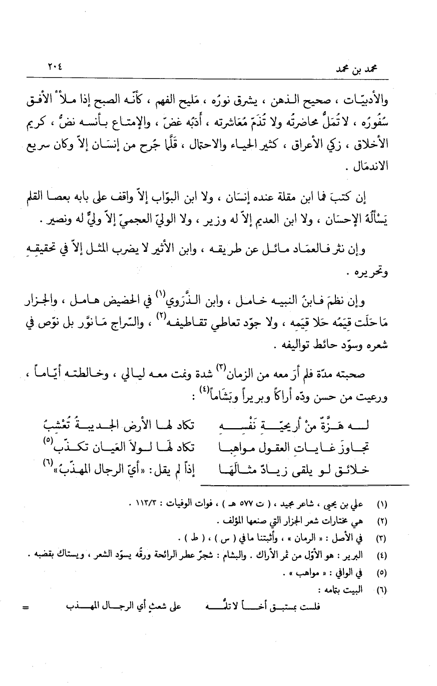 والأدبيات، صحيح الذهن، يشرق نوره، مليح الفهم، كأنه الصبح إذا ملأ الأفق سفورُه، لا تُملُّ محاضرته، ولا تُذام معاشرته، أدبه غض، والإمتاع بأنسه نضّ، كريم الأخلاق، زكي الأعراق، كثير الحياء والاحتمال، قلما جُرح من إنسان إلا وكان سريع الاندمال.