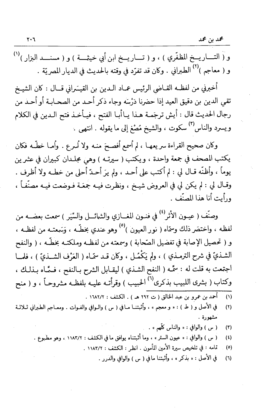 والتاريخ المظفّري، وتاريخ ابن أبي خيثمة ومسند البزار ومعاجم الطبراني. وكان قد تفرّد في وقته بالحديث في الديار المصرية.