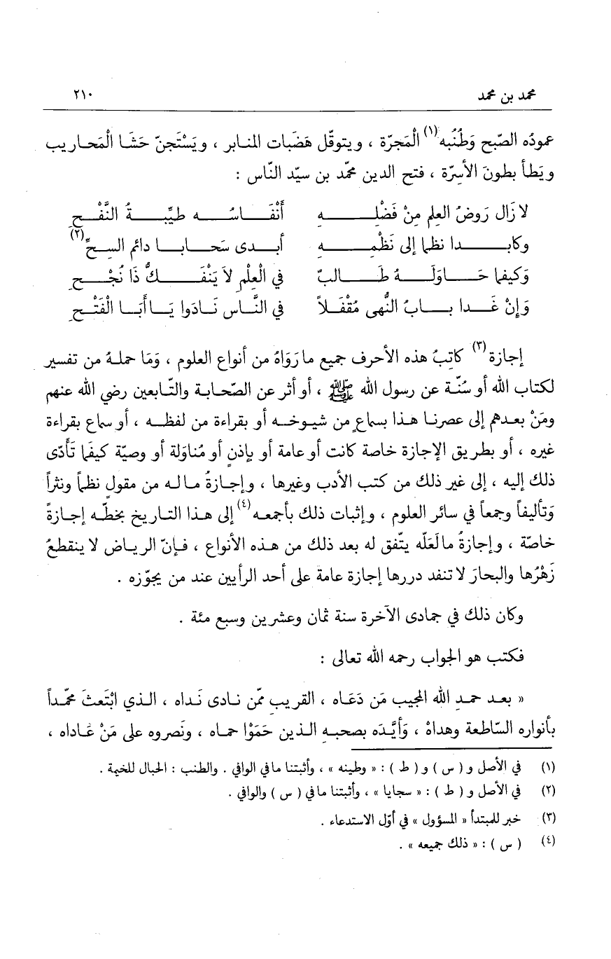 إجازة كاتب هذه الأحرف جميع ما رواه من أنواع العلوم، وما حمله من تفسير لكتاب الله أو سُنّة عن رسول الله صَلَّى اللهُ عَلَيْهِ وَسَلَّمَ، أو أثر عن الصحابة والتابعين رضي الله عنهم ومَن بعدهم الى عصرنا هذا بسماع من شيوخه أو بقراءة من لفظه، أو سماع بقراءة غيره، أو بطريق الإجازة خاصة كانت أو عامة أو بإذن أو مُناوَلة أو وصية كيفما تأدّى ذلك إليه، الى غير ذلك من كتب الأدب وغيرها، وإجازةُ ما له من مقولٍ نظماً ونثراً وتأليفاً وجمعاً في سائر العلوم، وإثبات ذلك بأجمعه الى هذا التاريخ بخطّه إجازة خاصة، وإجازة ما لعلّه يتّفق له بعد ذلك من هذه الأنواع، فإن الرياض لا ينقطعُ زهرُها والبحارَ لا تنفد دررها إجازة عامة على أحد الرأيين عند من يجوّزه.