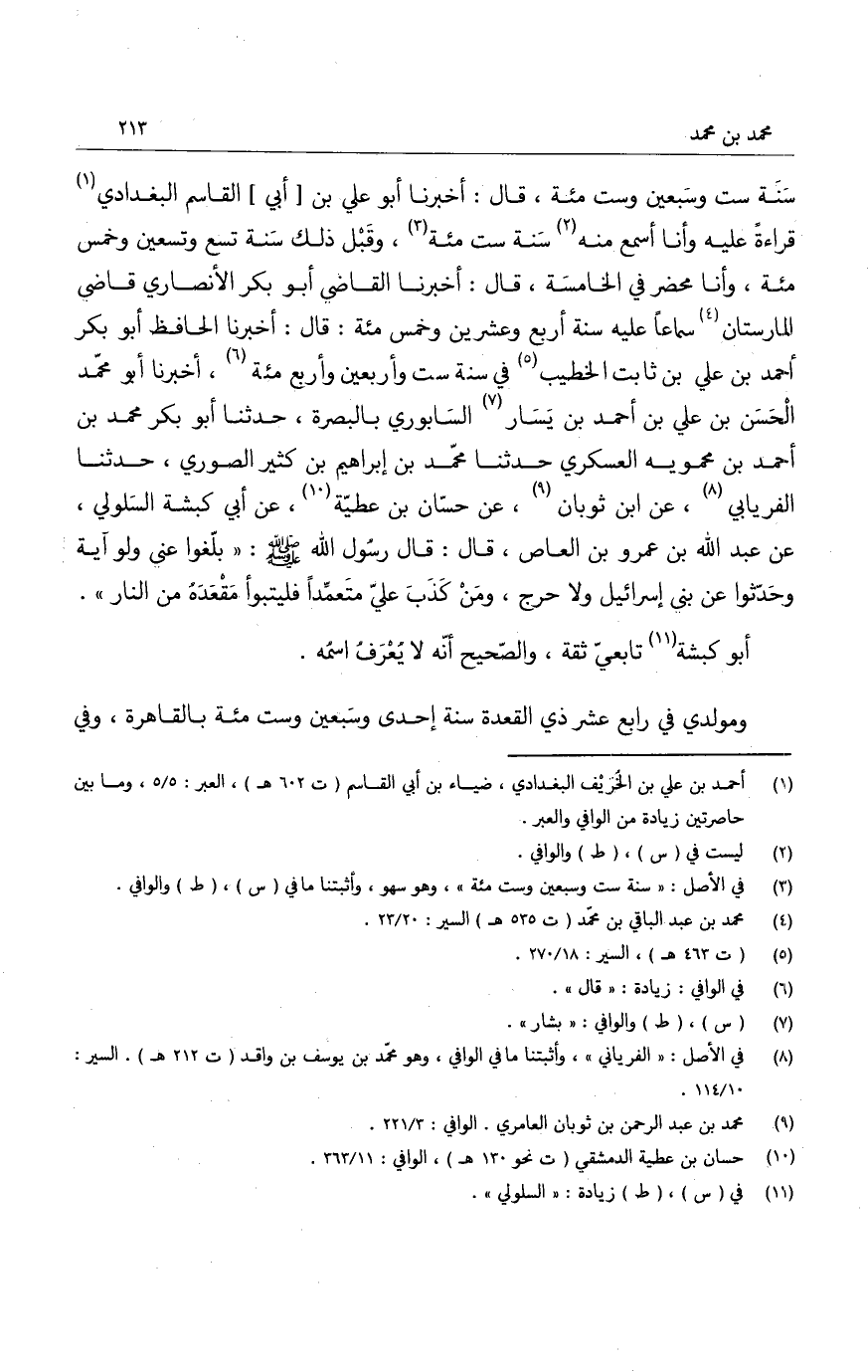 سنة ست وسبعين وست مئة، قال: أخبرنا أبو علي بن أبي القاسم البغدادي قراءةً عليه وأنا أسمع منه سنة ست مئة، وقبل ذلك سنة تسع وتسعين وخمس مئة، وأنا محضر في الخامسة، قال: أخبرنا القاضي أبو بكر الأنصاري قاضي المارستان سماعاً عليه سنة أربع وعشرين وخمس مئة: قال: أخبرنا الحافظ أبو بكر أحمد بن علي بن ثابت الخطيب في سنة ست وأربعين وأربع مئة، أخبرنا أبو محمد الحسن بن علي بن أحمد بن يسار السابوري بالبصرة، حدثنا أبو بكر محمد بن أحمد بن محمويه العسكري حدثنا محمد بن ابراهيم بن كثير الصوري، حدثنا الفريابي، عن ابن ثوبان، عن حسّان بن عطية، عن أبي كبشة السلولي، عن عبد الله بن عمرو بن العاص، قال: قال رسول الله صَلَّى اللهُ عَلَيْهِ وَسَلَّمَ: " بلّغوا عني ولو آية وحدّثوا عن بني إسرائيل ولا حرج، ومَن كذب عليّ متعمّداً فليتبوأ مقعده من النار ".
