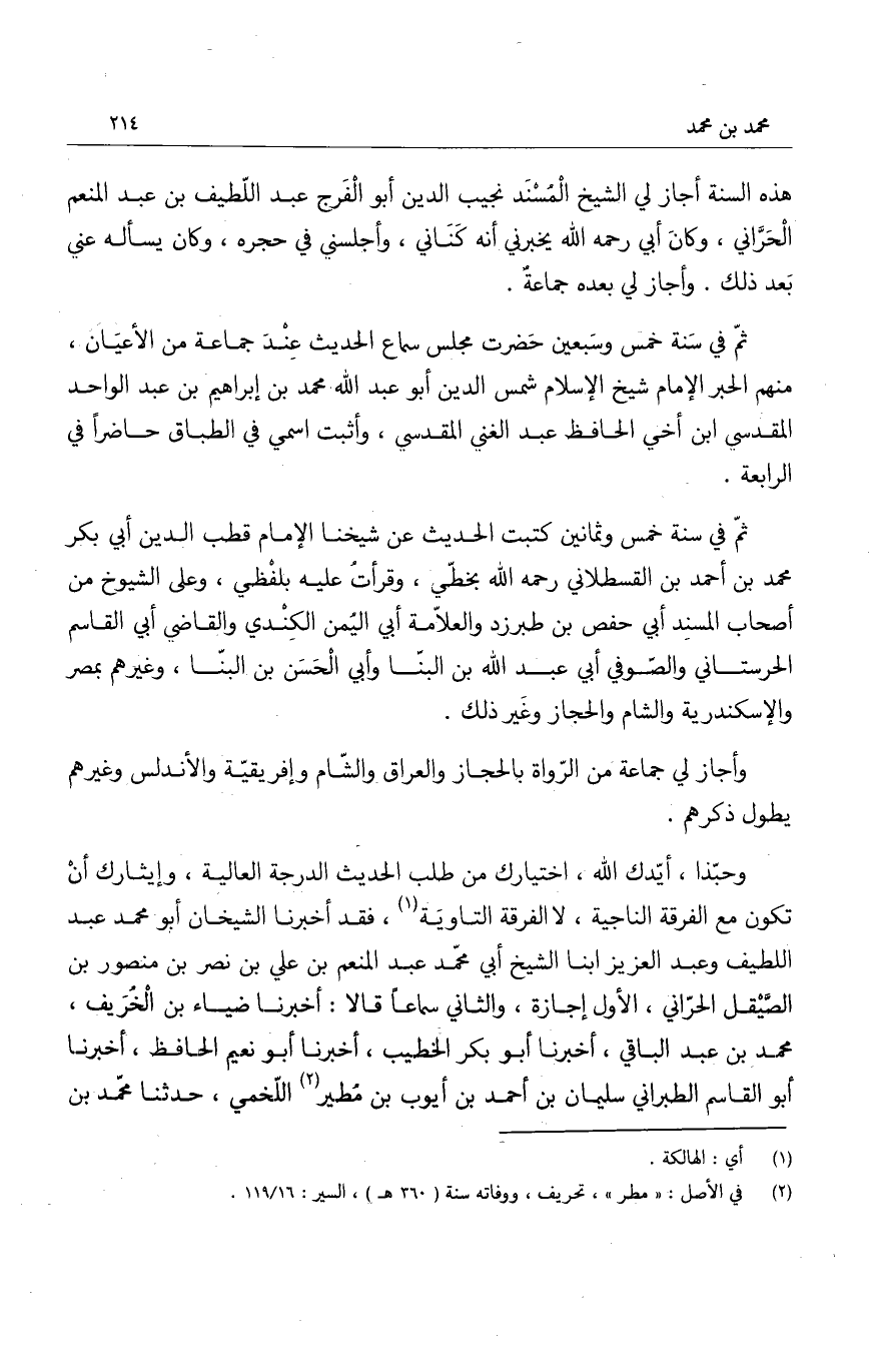 وحبّذا، أيدك الله، اختيارك من طلب الحديث الدرجة العالية، وإيثارك أن تكون مع الفرقة الناجية، لا الفرقة التاوية، فقد أخبرنا الشيخان أبو محمد عبد اللطيف وعبد العزيز ابنا الشيخ أبي محمد عبد المنعم بن علي بن نصر بن منصور بن الصّيْقل الحراني، الأول إجازة، والثاني سماعاً قالا: أخبرنا ضياء بن الخُرَيف، محمد بن عبد الباقي، أخبرنا أبو بكر الخطيب، أخبرنا أبو نعيم الحافظ، أخبرنا أبو القاسم الطبراني سليمان بن أحمد بن أيوف بن مُطير اللّخمي، حدّثنا محمد بن