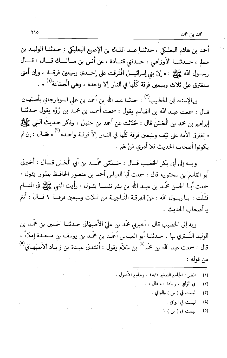 أحمد بن هاشم البعلبكي، حدثنا عبد الملك بن الإصبع البعلبكي: حدثنا الوليد بن مسلم، حدثنا الأوزاعي، حدثني قتادة، عن أنس بن مالك قال: قال رسول الله صَلَّى اللهُ عَلَيْهِ وَسَلَّمَ: " إن بني إسرائيل افترقت على إحدى وسبعين فرقة، وإن أمتي ستفترق على ثلاث وسبعين فرقة كُلها في النار إلا واحدة، وهي الجماعة ".