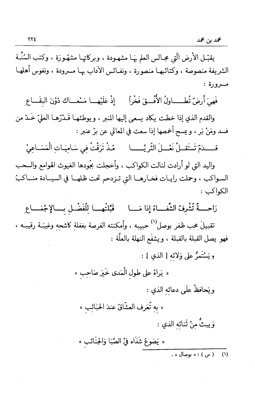 يقبّل الأرض التي مجالس العلم بها مشهودة، وبركاتها مشهورة، وكتب السنّة الشريفة منصوصة، وكتائبها منصورة، ونفائس الآداب بها مسرودة، ونفوس أهلها مسرورة: