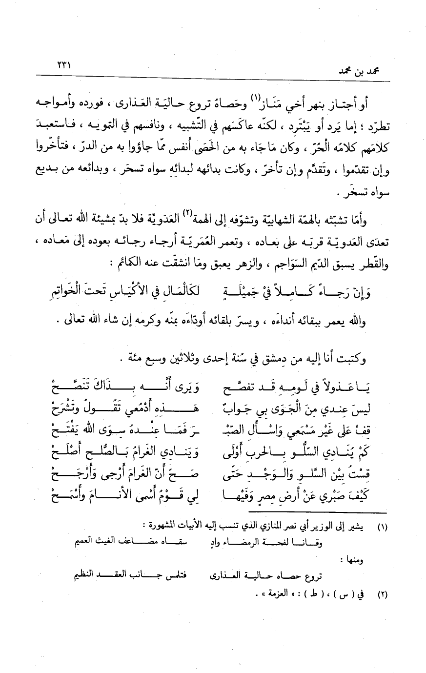 وأما تشبهه بالهمة الشهابية وتشوّفه الى الهمة العدوية فلابد بمشيئة الله تعالى أن تعدّى العدوية قربه على بعاده، وتعمر العُمرية أرجاء رجائه بعوده الى معاده، والقطر يسبق الدين السواجم، والزهر يعبق وما انشقّت عنه الكمائم: