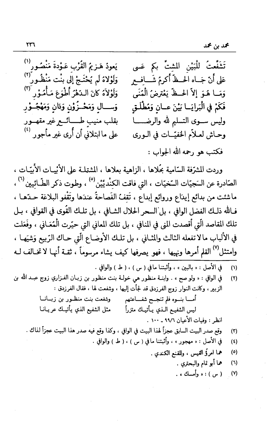 وردت المشرّفة السامية بحُلاها، الزاهية بعلاها، المشتملة على الأبيات الأبيّات، الصادرة عن السجيات السخيّات، التي فاقت الكنديّيْن، وطوت ذكر الطائيين، ما شئت من بدائع إيداع وروائع إبداع، تقف الفصاحةُ عندها وتقْفو البلاغة حدّها، فالله ذلك الفضل الوافي، بل السحر الحلال الشافي، بل تلك القُوى في القوافي، بل تلك المقاصد التي أقصدت المنى في المنافي، بل تلك المعاني التي حيّرت المُعاني، وفعلت في الألباب ما تفعله الثالث والمثاني، بل تلك الأوضاع التي حاك الربيع وشيَها، وامتثل القلم أمرها ونهيها، فهو يصرفها كيف يشاء مرسوماً، ثقة أنها لا تخالف له