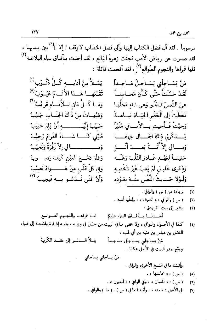 مرسوماً. لقد آل فضل الكتاب إليها وآلى فصل الخطاب لا وقف إلا بين يديها، لقد صدرت عن رياض الأدب فجنَت زهره اليانع، لقد أخذت بآفاق سماء البلاغة فلها قمراها والنجوم الطوالع، لقد أفحمت قائلة:
