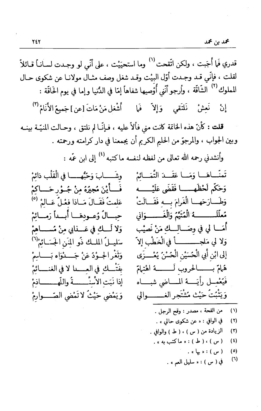 قدري فما أجبت، ولكن اتّقحت وما استحيَيت، على أني لو وجدت لساناً قائلاً لقلت، فإني قد وجدت أول البيت وقد شغل وصف مثال مولانا عن شكوى حال المملوك الشاقة، وأرجو أنني أوصيها شفاها إما في الدنيا وإما في يوم الحاقة: