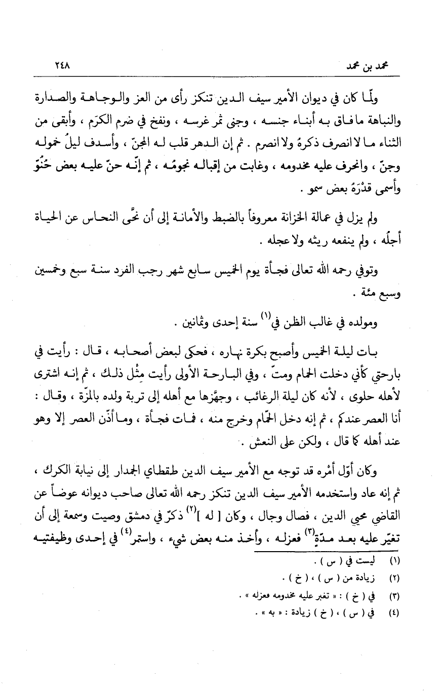 ولم يزل في عمالة الخزانة معروفاً بالضبط والأمانة الى أن نحّى النحاس عن الحياة أجلُه، ولم ينفعه ريثه ولا عجله.